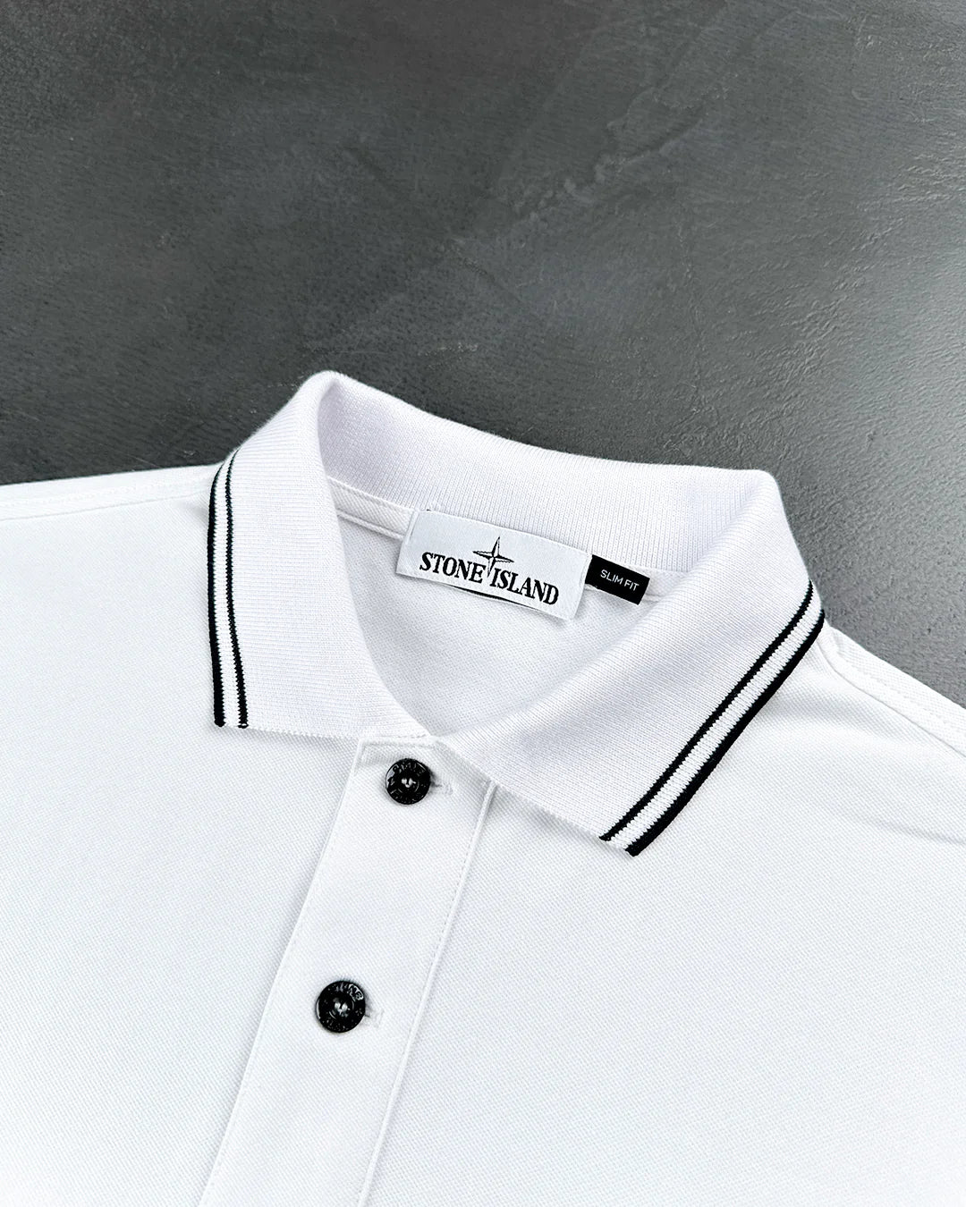 Приталений крій. Комір на 2-х ґудзиках з трикотажної гумки, по краях дві паралельні смужки білого кольору. На грудях нашивка з емблемою Stone Island у вигляді троянди вітрів. Облямівка рукавів - в гумку з двома паралельними смужками. Бічні розрізи оздоблені зсередини бавовняною тасьмою.