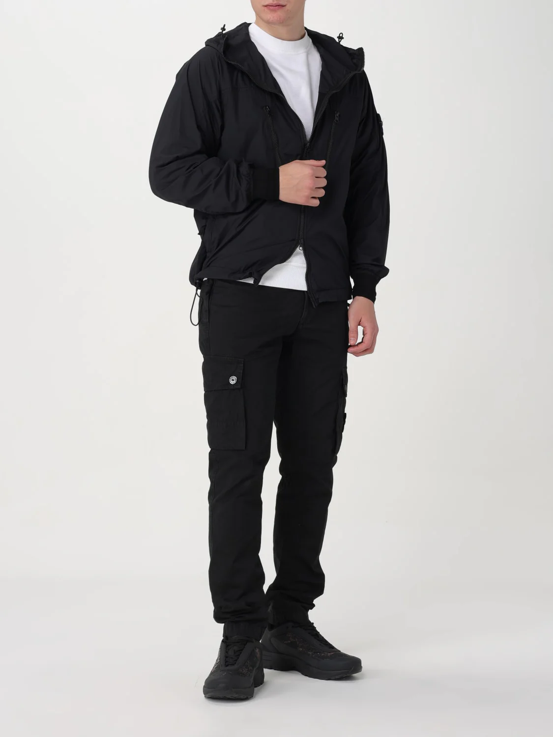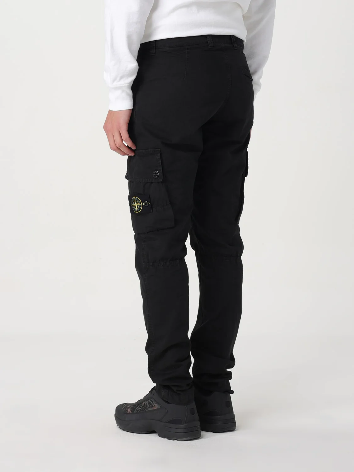 Завужений крій. Врізні кишені з потайною застібкою на блискавку. Одна задня кишеня з потайною застібкою на блискавку. По одній кишені на кожній штанині з клапаном; ліва кишеня з емблемою Stone Island. Посилена посадка. Застібка на блискавку та ґудзик.