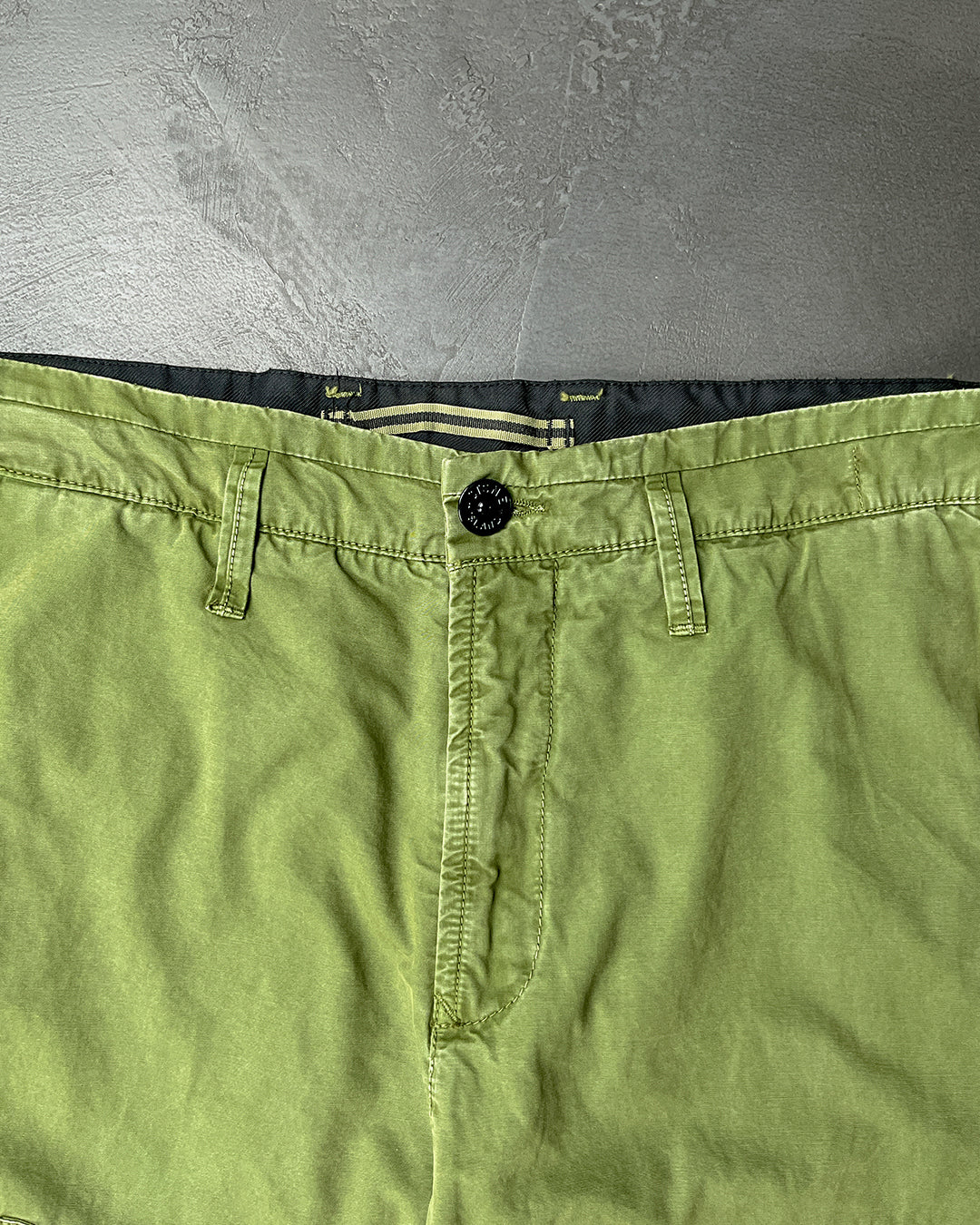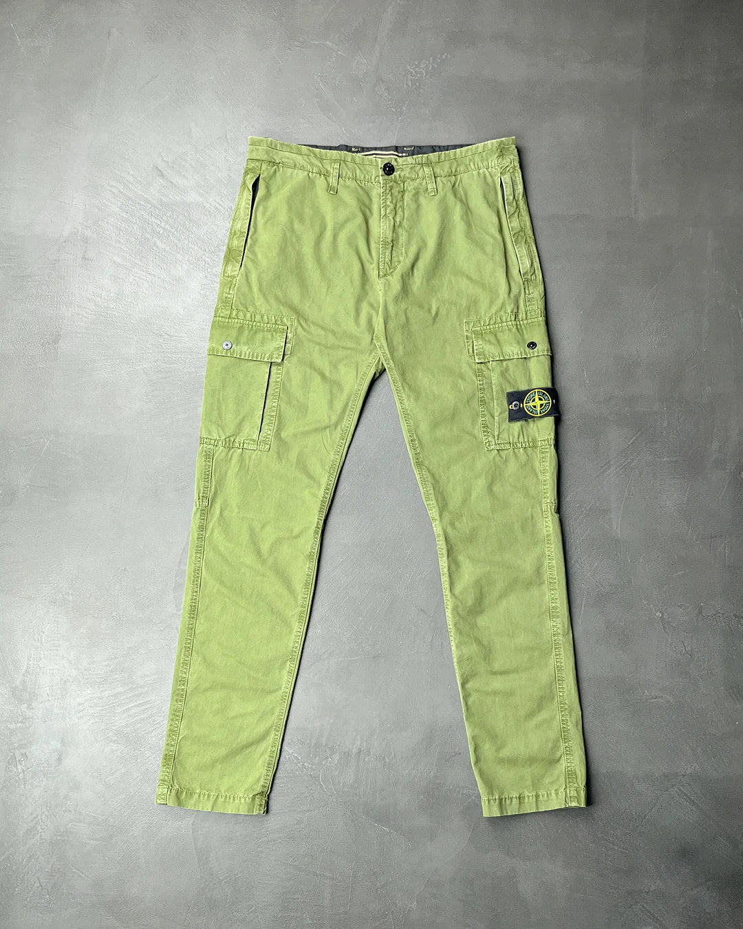 Брюки-карго з ломаного бавовняного твілу з ефектом старовинності. Ексклюзивна технологія фарбування готового виробу та наступного вицвітання OLD дозволяє надати текстурі трохи потертий вигляд і ефект 3D. Класичний заужений силует. Прорізні кишені на прихованій блискавці. Ззаду: прорізна кишеня на прихованому гудзику. На штанинах: нашита кишеня з клапаном на гудзику. Еластичний пояс з внутрішньою стяжкою.