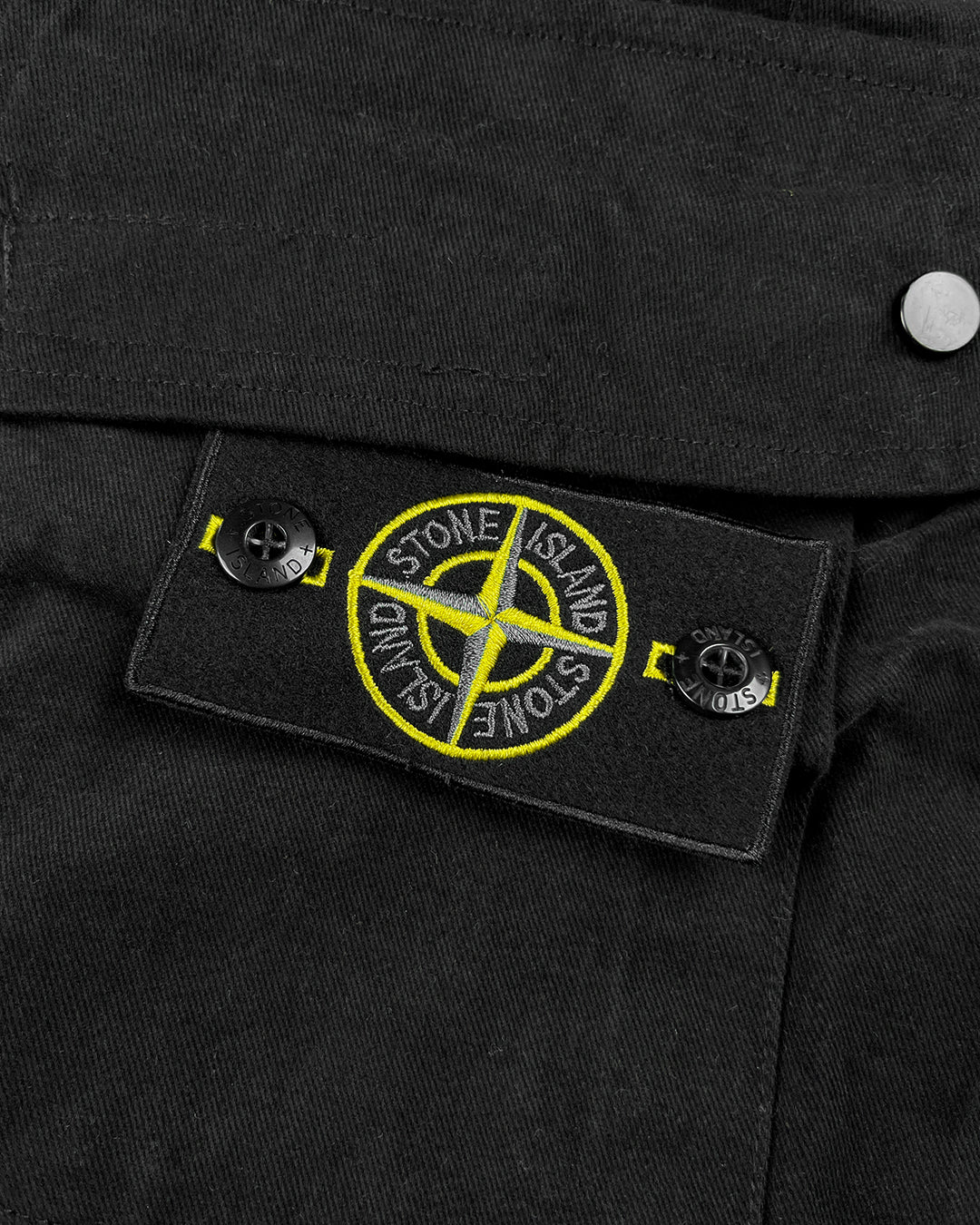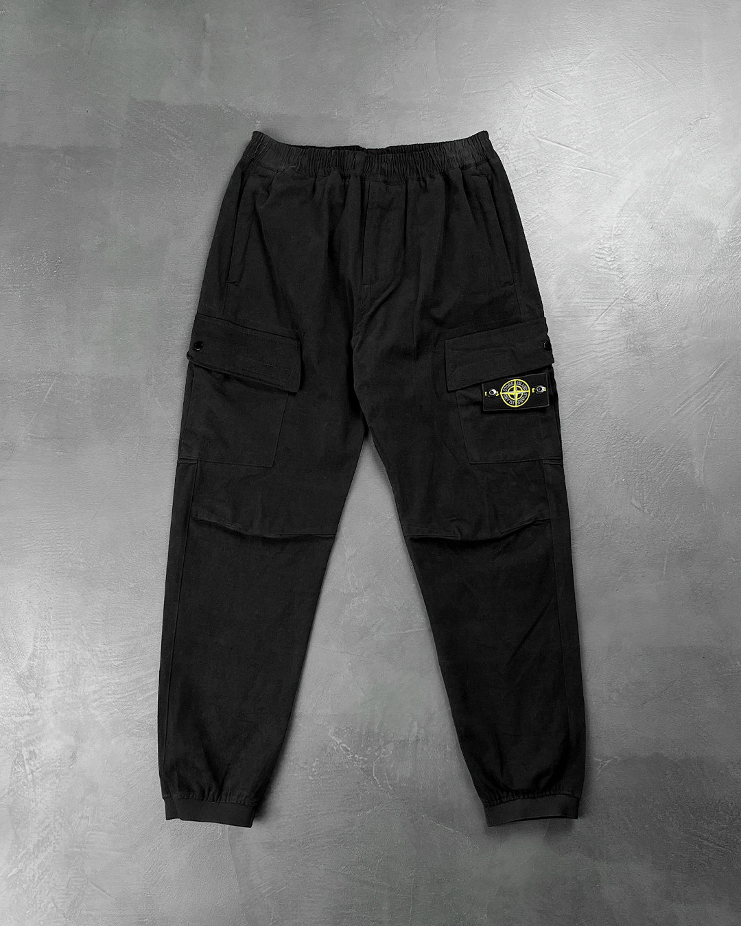 Мають регулярний завужений крій, поясні кишені на потайній блискавці, одну задню кишеню з потайною застібкою, кишеню з клапаном і потайними прес-шпильками на штанинах. Посилені наколінники, еластичні манжети та пояс з внутрішнім шнурком. Застібка на блискавку. На лівій кишені значок Stone Island.