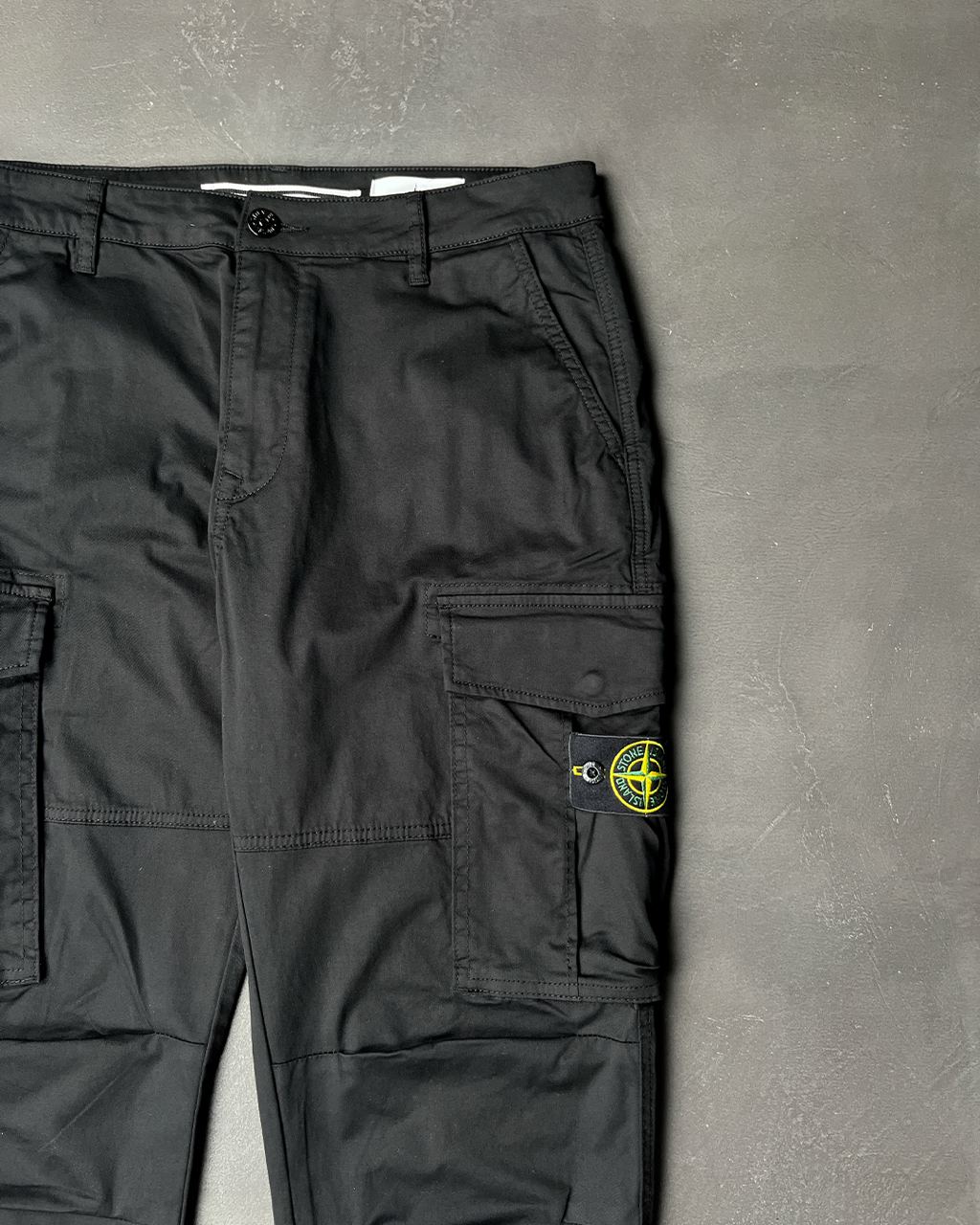 Штани-карго з еластичного рваного бавовняного твілу. Окрашений виріб з обробкою "OLD", ексклюзивною технологією фарбування та наступним вицвітанням готового одягу для створення легкого зношеного та тривимірного вигляду.