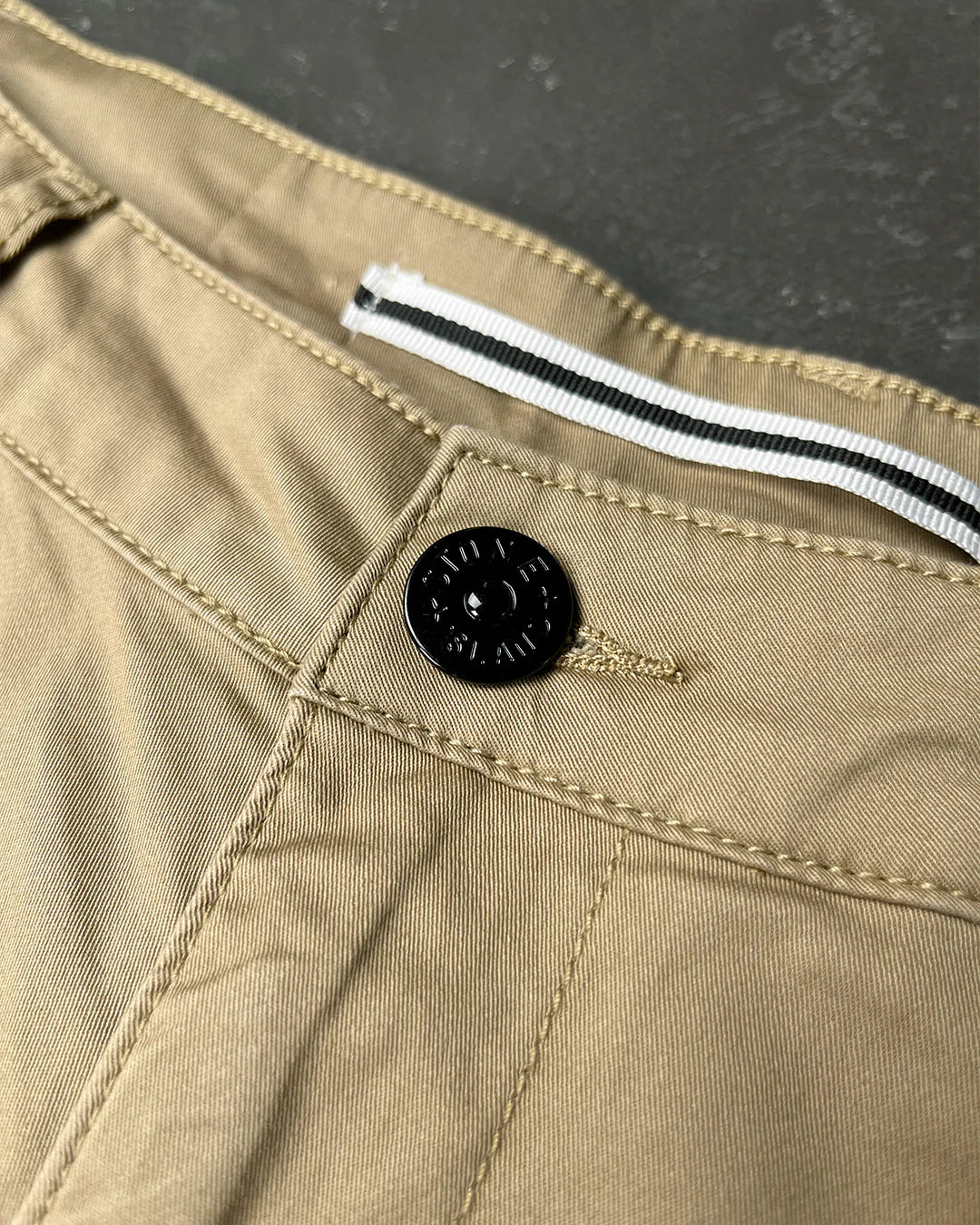 Звичайна заужена посадка. Кишені для рук у швах. Одна прорізна кишеня ззаду на прихованому гудзику. На кожній штанині по одній накладній кишені-книжці з клапаном на гудзику. Еластичний пояс з внутрішньою шнурівкою. Застібка-блискавка.