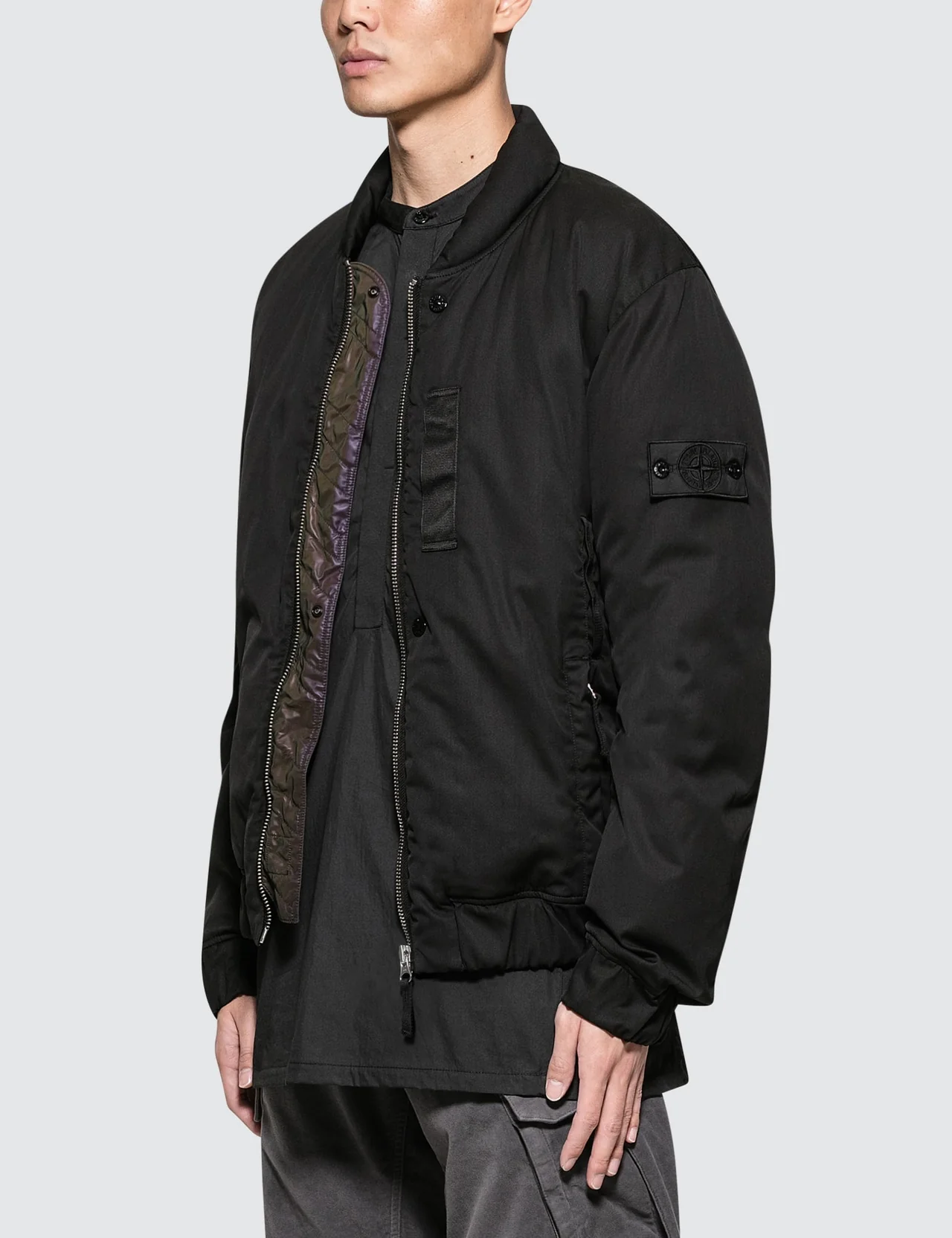 40401 Shadow Project Bomber Jacket — це інноваційний пуховик-бомбер, виготовлений із D-NW — одношарової тканини, яка поєднує нейлон і вовну з діагональним переплетенням. Така структура забезпечує легкість, міцність, еластичність і теплоізоляцію. Фінальна обробка спеціальним засобом проти крапель захищає тканину від води та бруду, а фарбування додає стильного вигляду.