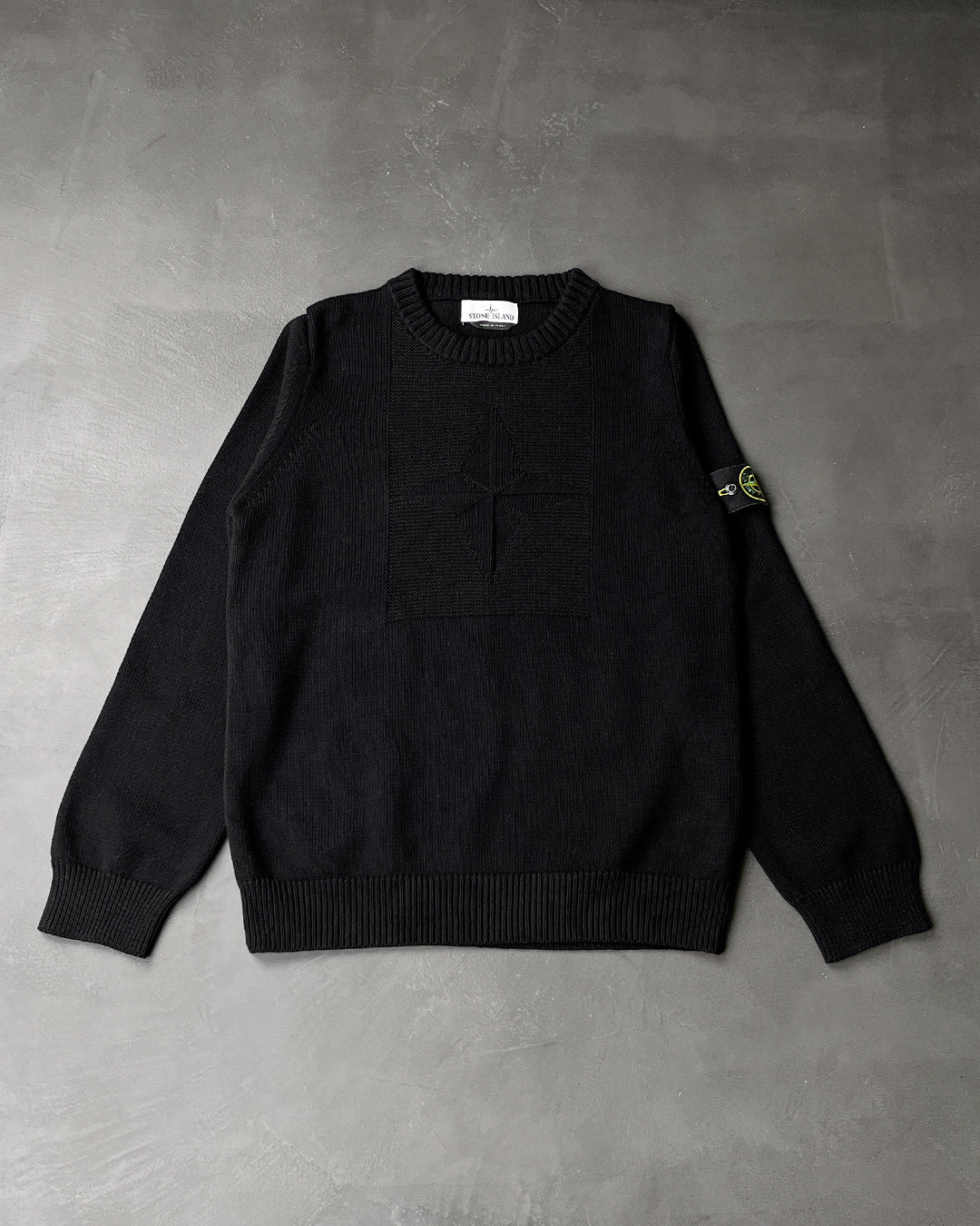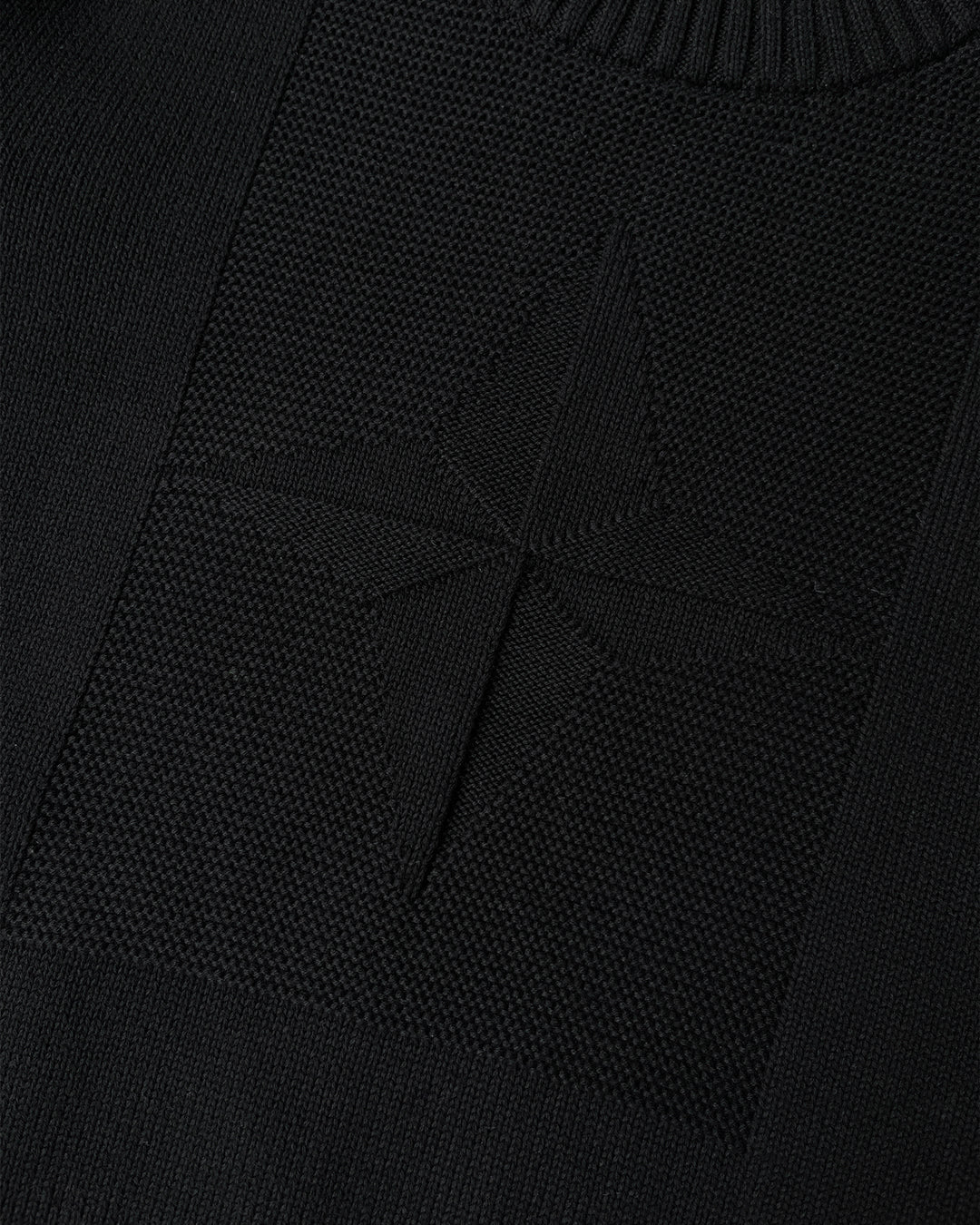 Светр чорного кольору із коміром-стійкою, з вовни та нейлону букле. Комбінація технік шиття створює легкий аранський мотив. Плоска ребриста шия. Опущені плечі. На грудях фірмовий візерунок бренду у вигляді троянди вітрів. Ребристі манжети та поділ.