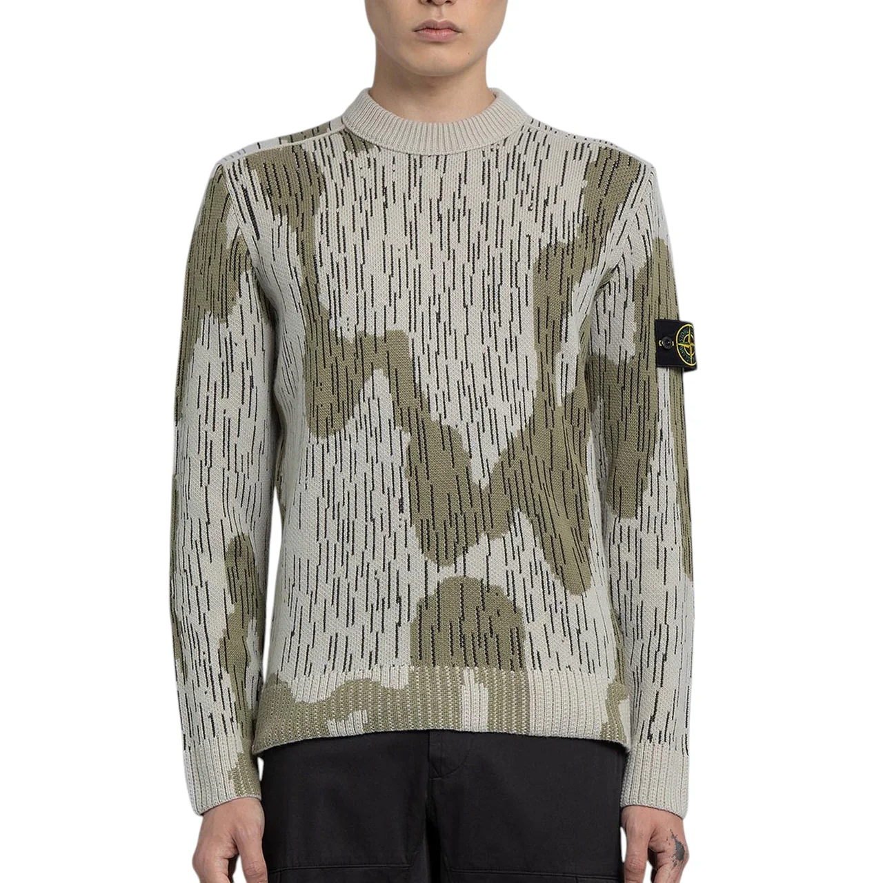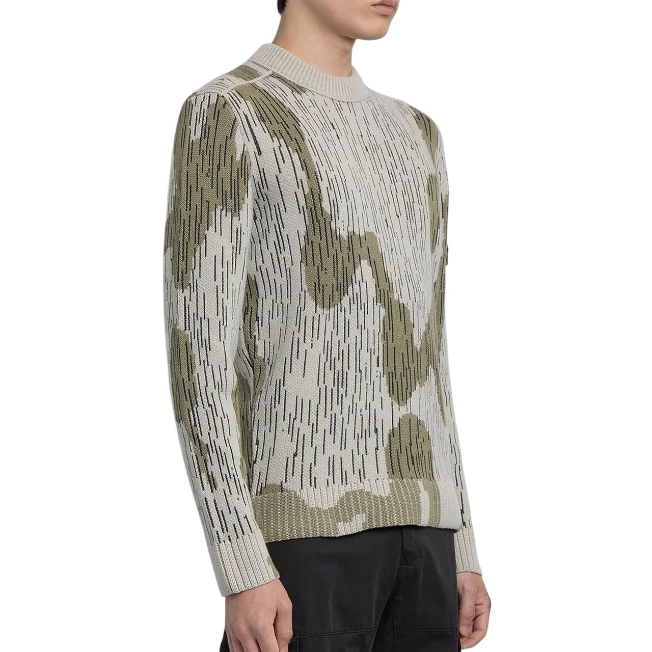 575D5 Mixed Yarn Sweater Rain Camo – джемпер із круглим вирізом, виготовлений зі змішаної пряжі на основі бавовни, вовни, віскози та нейлону. Виконаний у жакардовій техніці, він прикрашений сезонним камуфляжним мотивом Rain Camo, що надає виробу унікального вигляду та текстури.