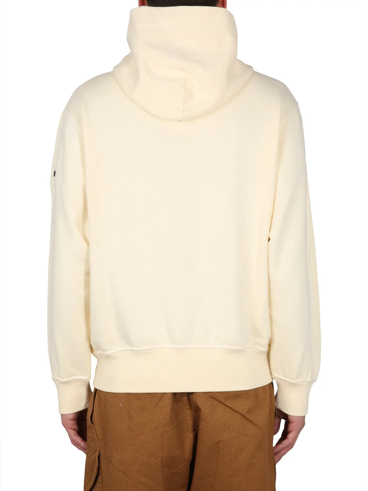 Худі з капюшоном з бавовняного флісу. Виріб пофарбований, має широкий крій. Капюшон з внутрішнім бавовняним кантом, в якому знаходиться шнурок. Рукава реглан, з рельєфним швом. Напівприхований значок Stone Island Shadow на лівому рукаві, абстрактна сезонна вишивка "Shadow" ззаду. Манжети та нижній пояс на резинці.