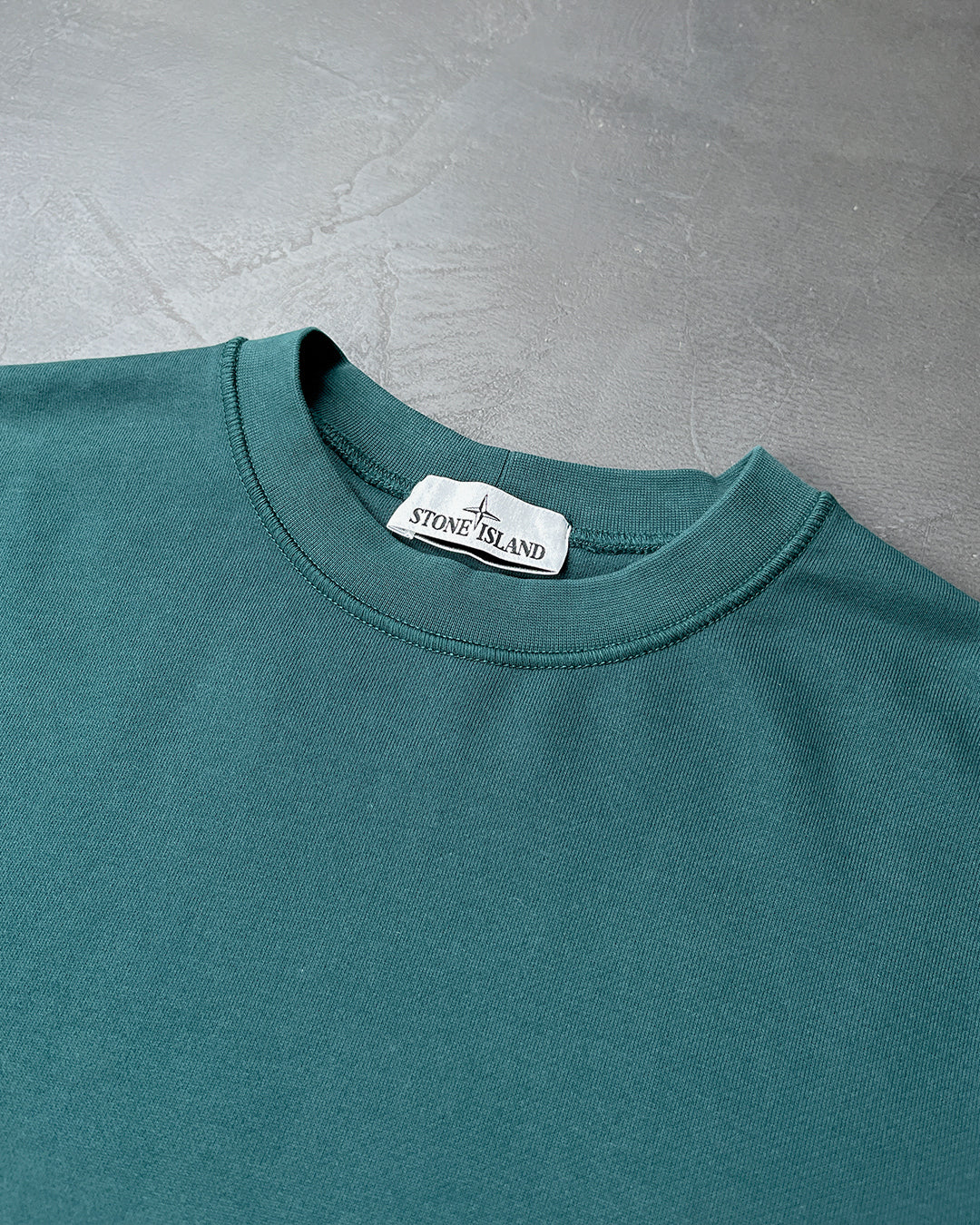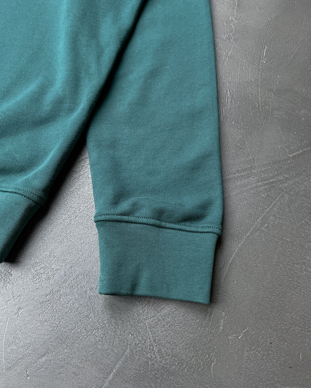 Світшот із круглим вирізом із мерсеризованого бавовняного флісу. Виріб пофарбовано в готовому вигляді. Горловина в резинку. Клиновидні вставки в гумку під рукавами. Манжети і низ в гумку.