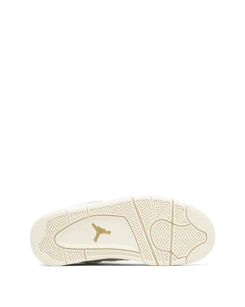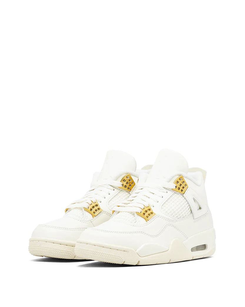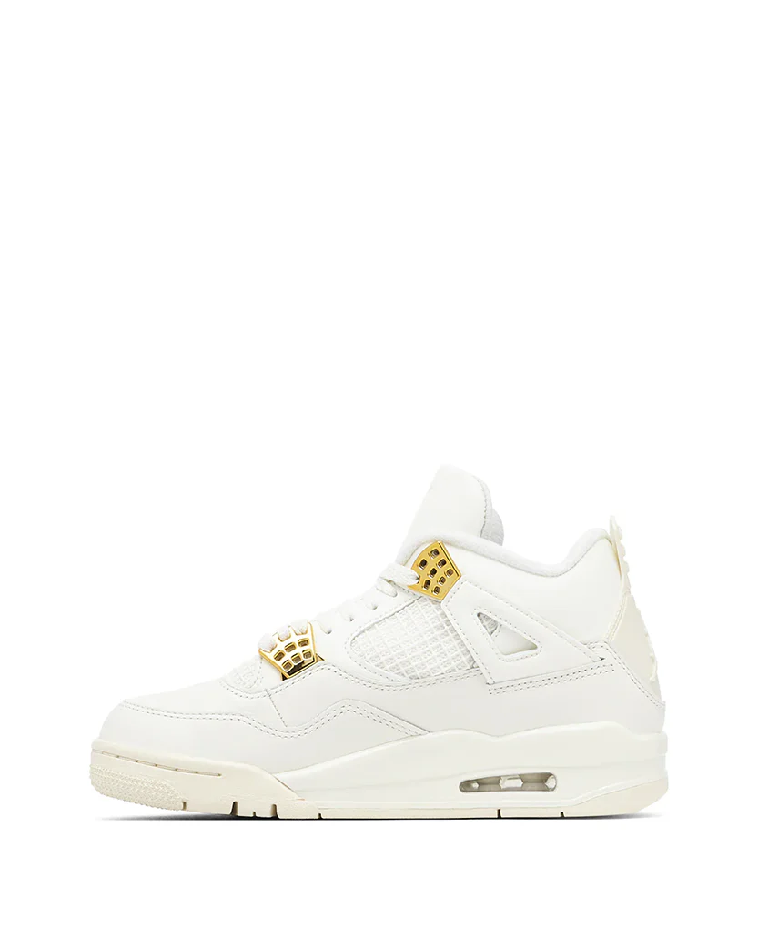 Жіноча модель Jordan 4 Retro Metallic Gold забарвлює Air Jordan 4 Retro у білосніжний колір і покращує впізнаваний силует за допомогою золотих акцентів. Верх, підошва та проміжна підошва забезпечують монохромну основу, яка дозволяє металевим золотим люверсам сяяти. Модель має загалом чотири металеві золоті люверси - по два з кожного боку мереживної клітинки. У той час як верх в основному складається з гладкої шкіри, чверть панелі демонструє сітку, яка забезпечує повітряне відчуття. Проміжна підошва містить видимий блок Air в п'яті, який додає чутливу амортизацію, не обтяжуючи взуття. З точки зору брендингу, логотип Jumpman можна знайти на язичку та п'ятці.
