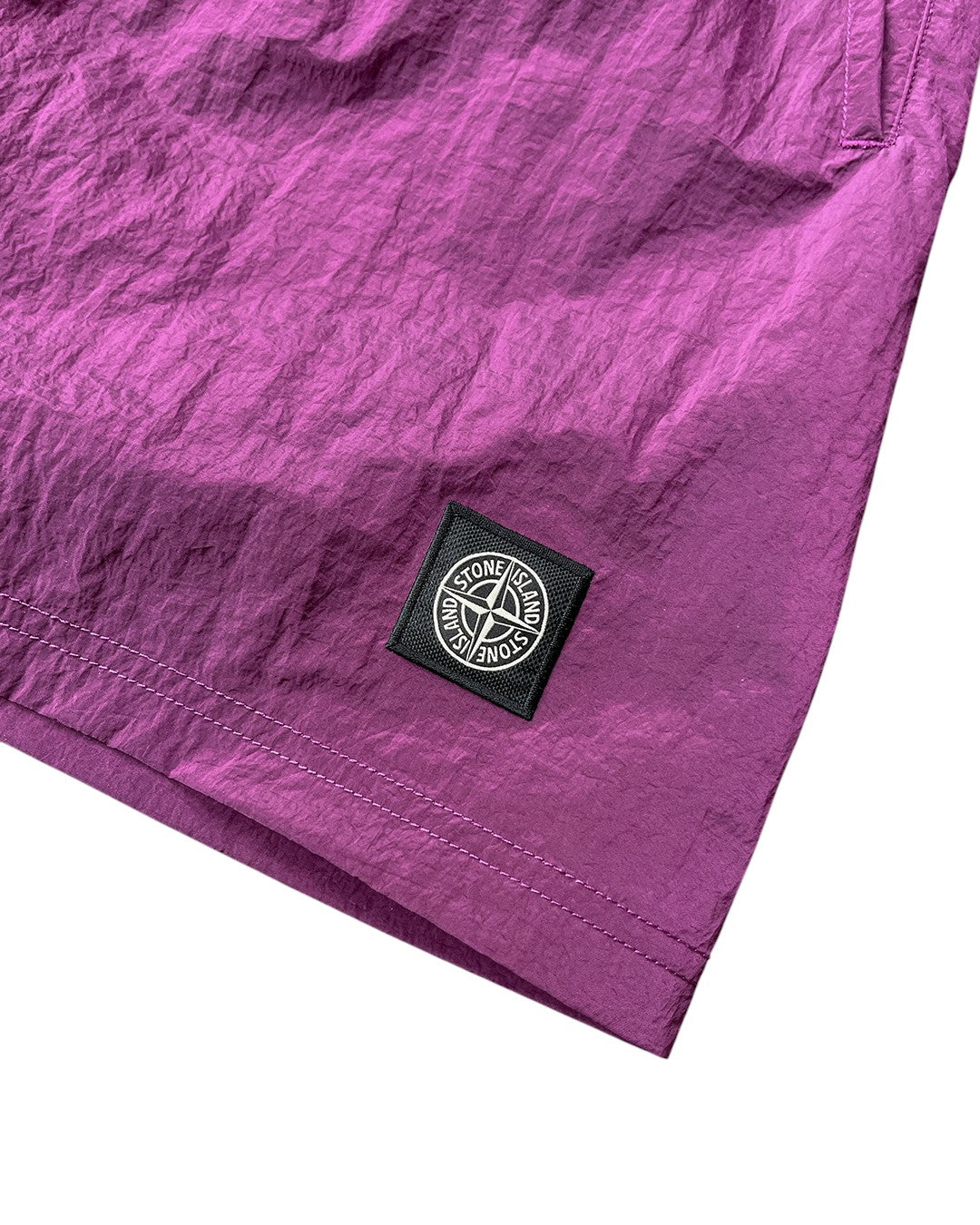 Плавальні шорти виконані з фірмової тканини Nylon Metal від Stone Island та пофарбовані у готовому вигляді, що створює легкий переливчастий ефект. Модель прикрашена нашивкою з компасом і доповнена трьома функціональними кишенями для зручності.