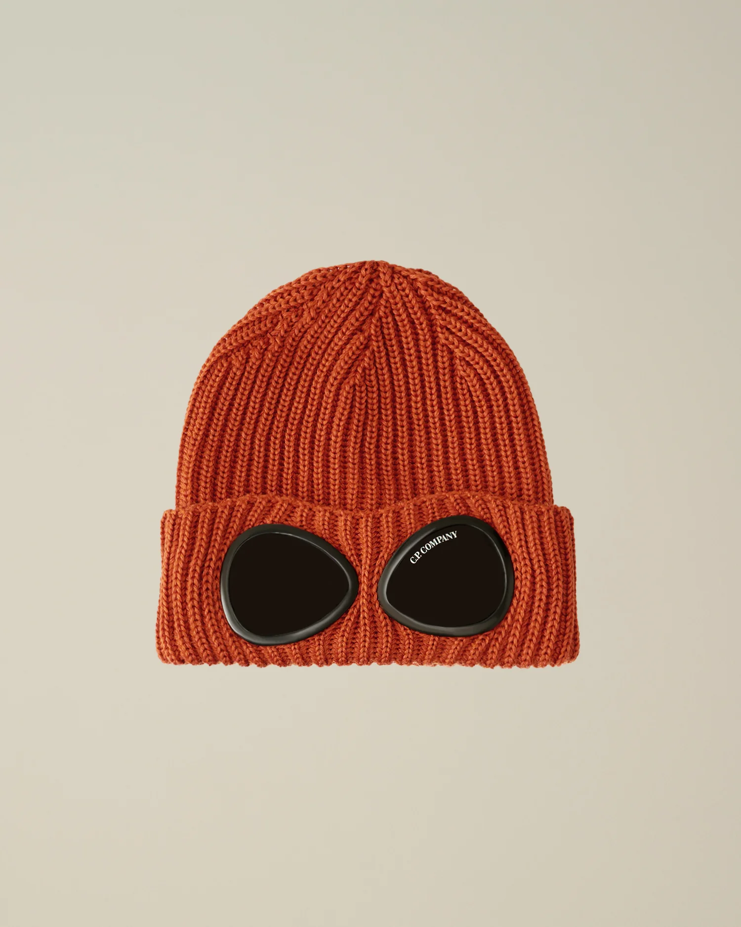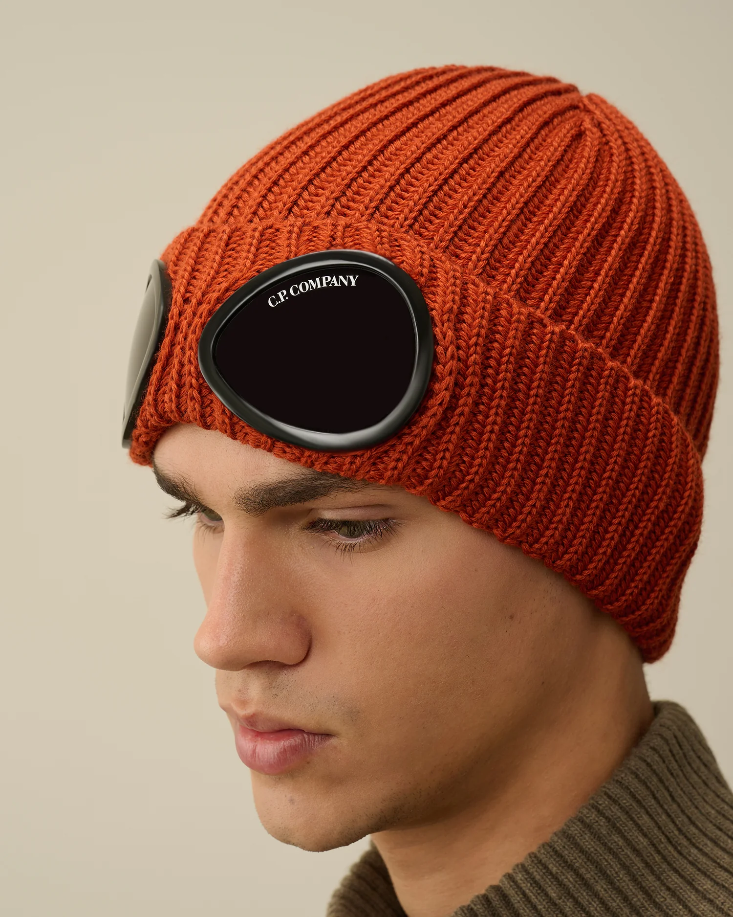 Шапка від C.P. Company виготовлена з вовни мериноса в рубчик. Вона має закруглені поля та прикрашена фірмовими лінзами з ацетату в тон з білим логотипом.
