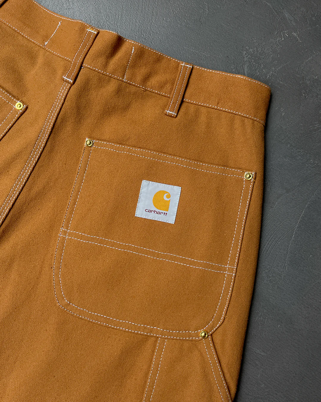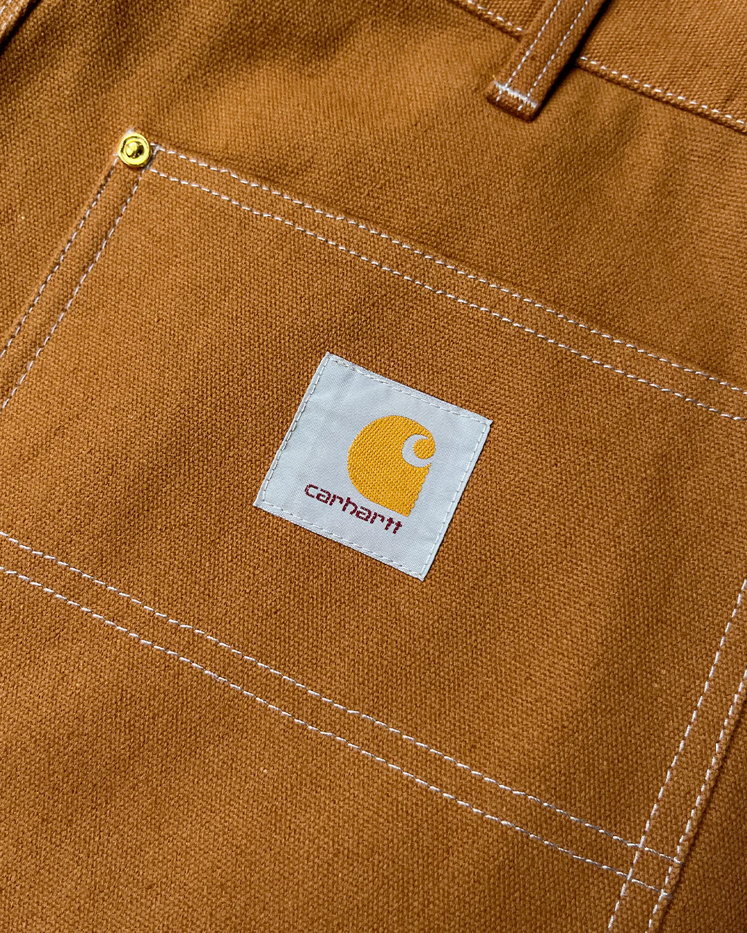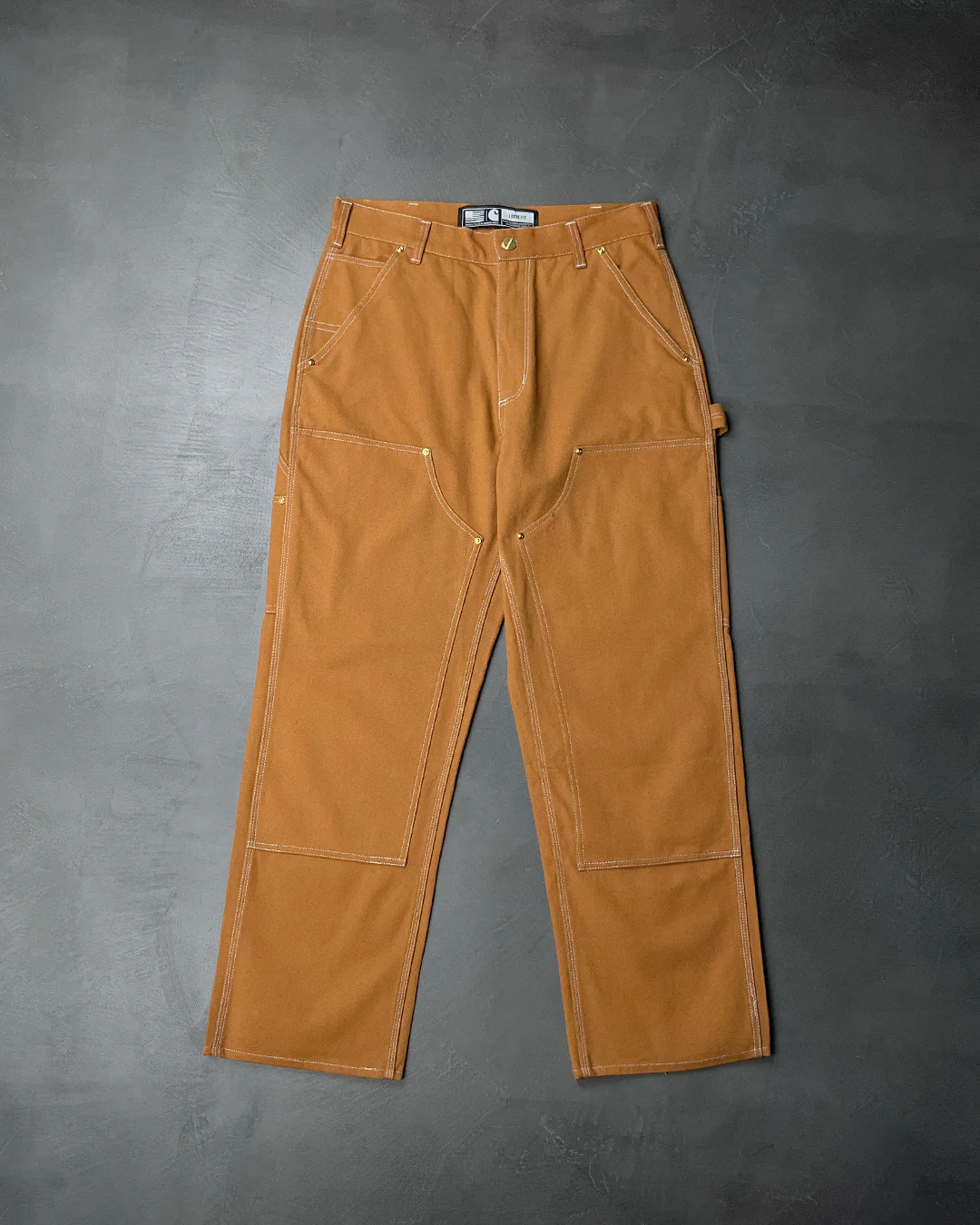 Штани B136 від Carhartt з подвійною передньою частиною сидять на талії та скроєні з повною посадкою. Мають кілька кишень для інструментів та інших дрібниць, а також петлю для молотка. Отвори для ніг мають розмір 19 дюймів, щоб можна було вдягнути робочі черевики.