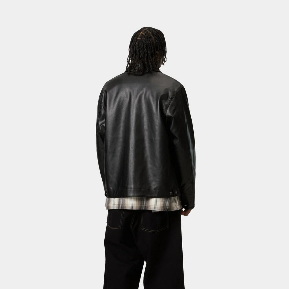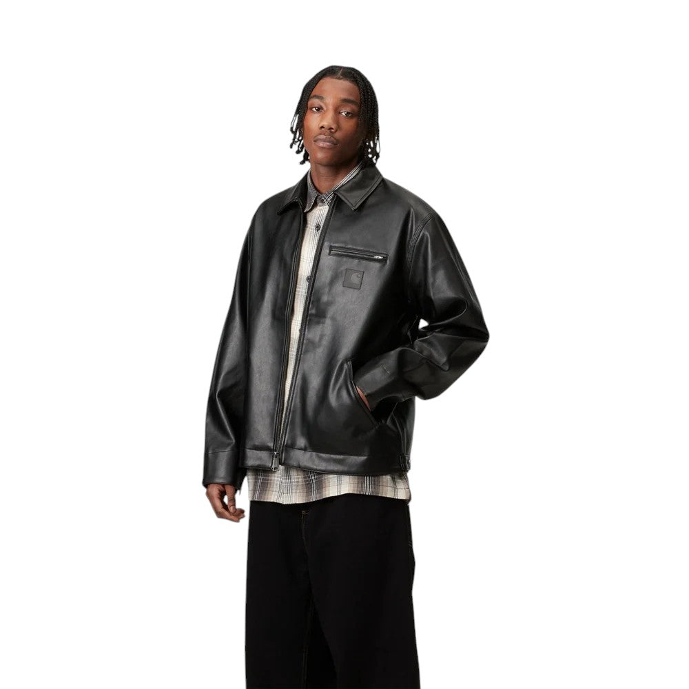 Куртка Detroit виконана з високоякісної поліуретанової віскози, що імітує текстуру натуральної шкіри, та доповнена нейлоновою підкладкою для комфорту та практичності. Модель оснащена двосторонньою блискавкою спереду, а також має регульовані манжети й нижній край — для індивідуальної посадки. На грудях розташована квадратна етикетка зі штучної шкіри в тон основного матеріалу,