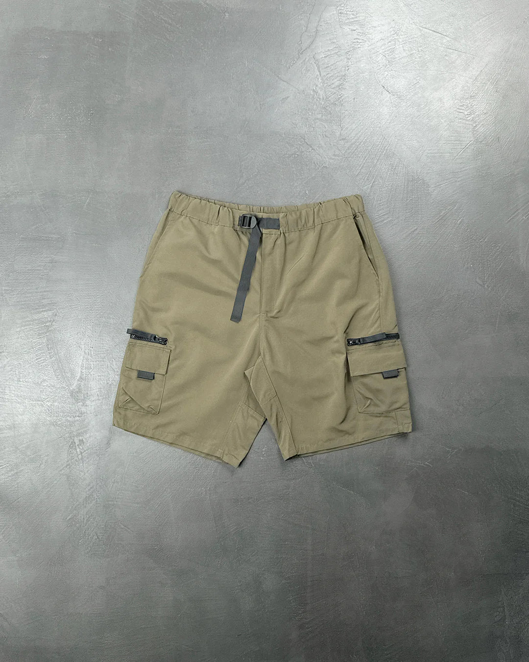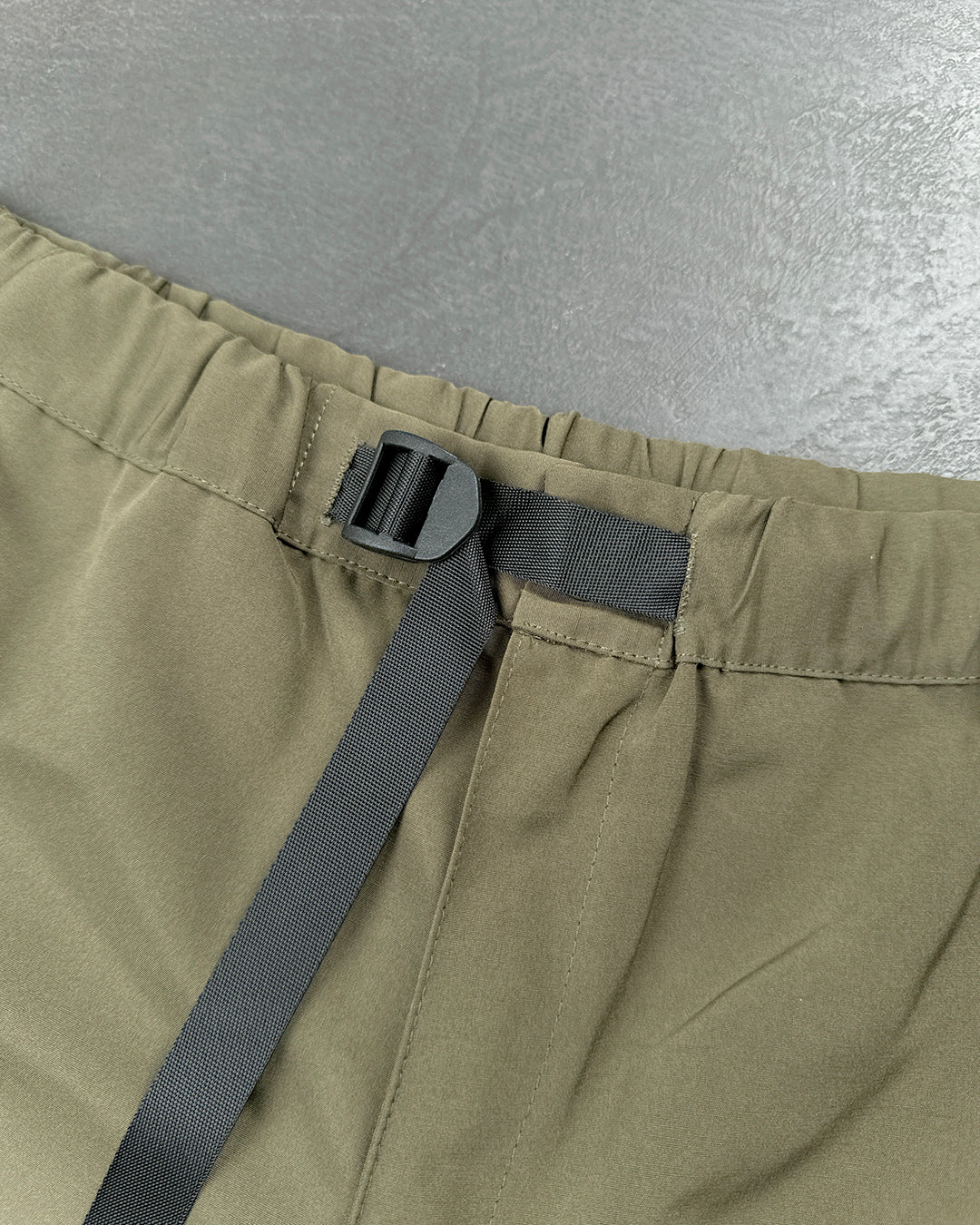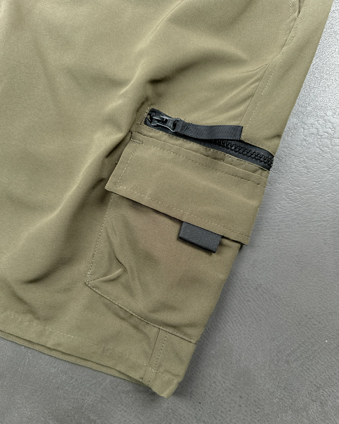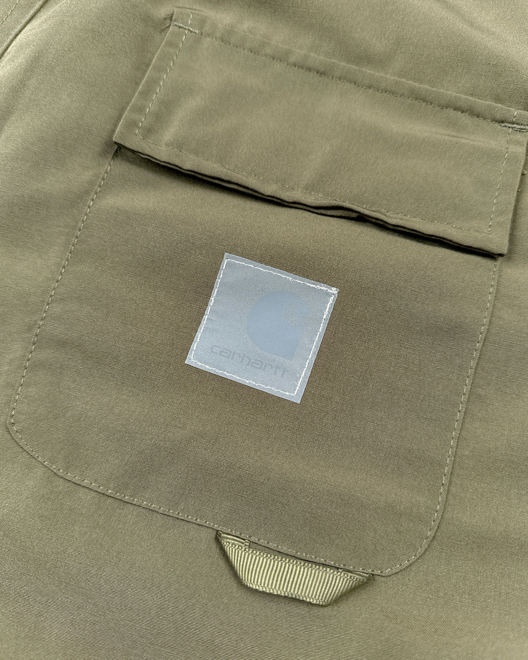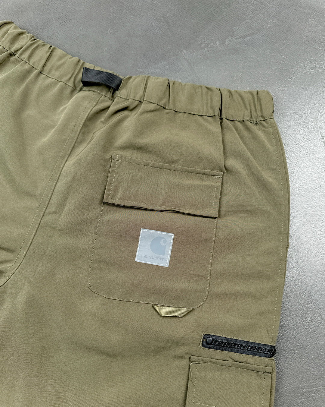 Шорти Elmwood Short виготовлені з технічної поліефірної тканини механічного розтягування, що має водовідштовхувальні властивості та забезпечує легкість рухів. Утилітарні функції включають кілька кишень, які застібаються на блискавку або липучку, а також регульований еластичний пояс на кліпсі. Задня кишеня підкреслена світловідбиваючою етикеткою Carhartt WIP. Шорти мають занижену талію та вільний крій.