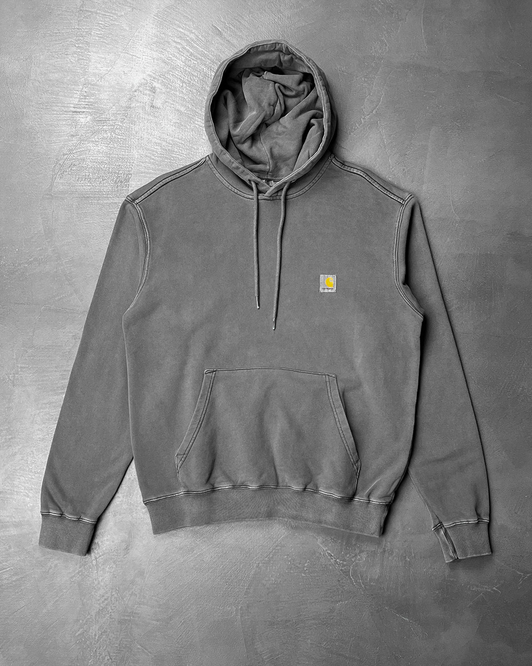 Худі з капюшоном від Carhartt WIP виготовлене з надзвичайно м'якої та комфортної бавовни з підкладкою з матового флісу. Воно має ребристі манжети та поділ, кишеню-кенгуру, а також капюшон на зав'язках. На грудях розміщена ткана нашивка з логотипом. Силует худі перефарбовано пігментним барвником, що надає йому невимушеного вигляду.