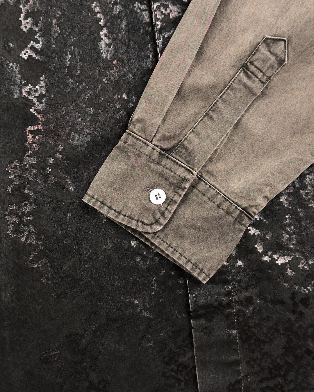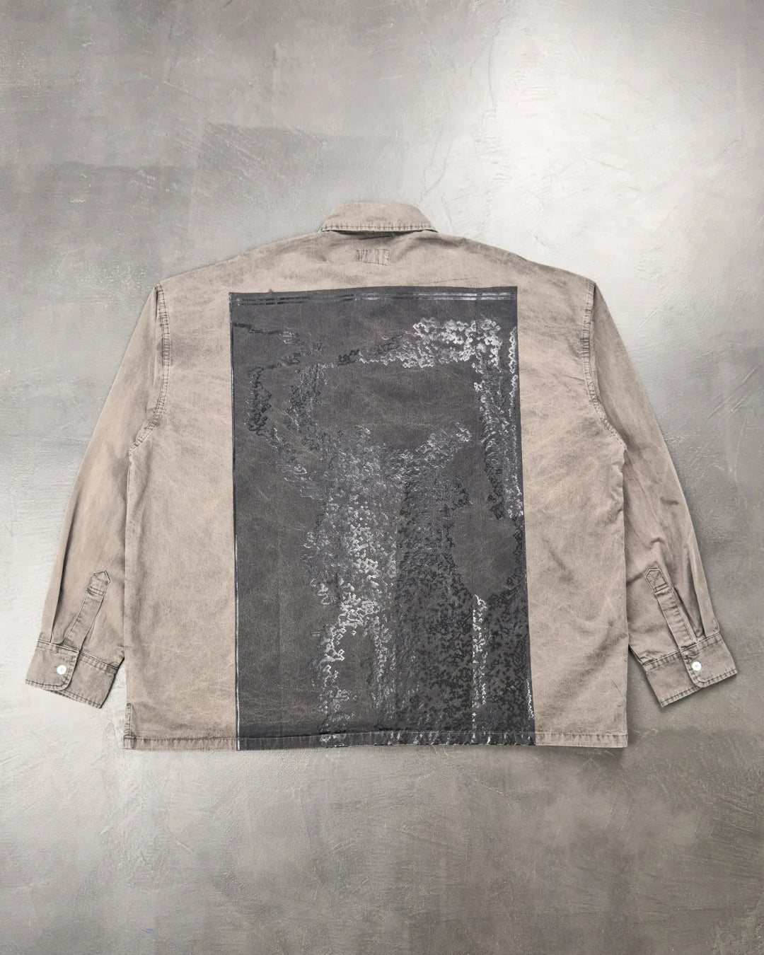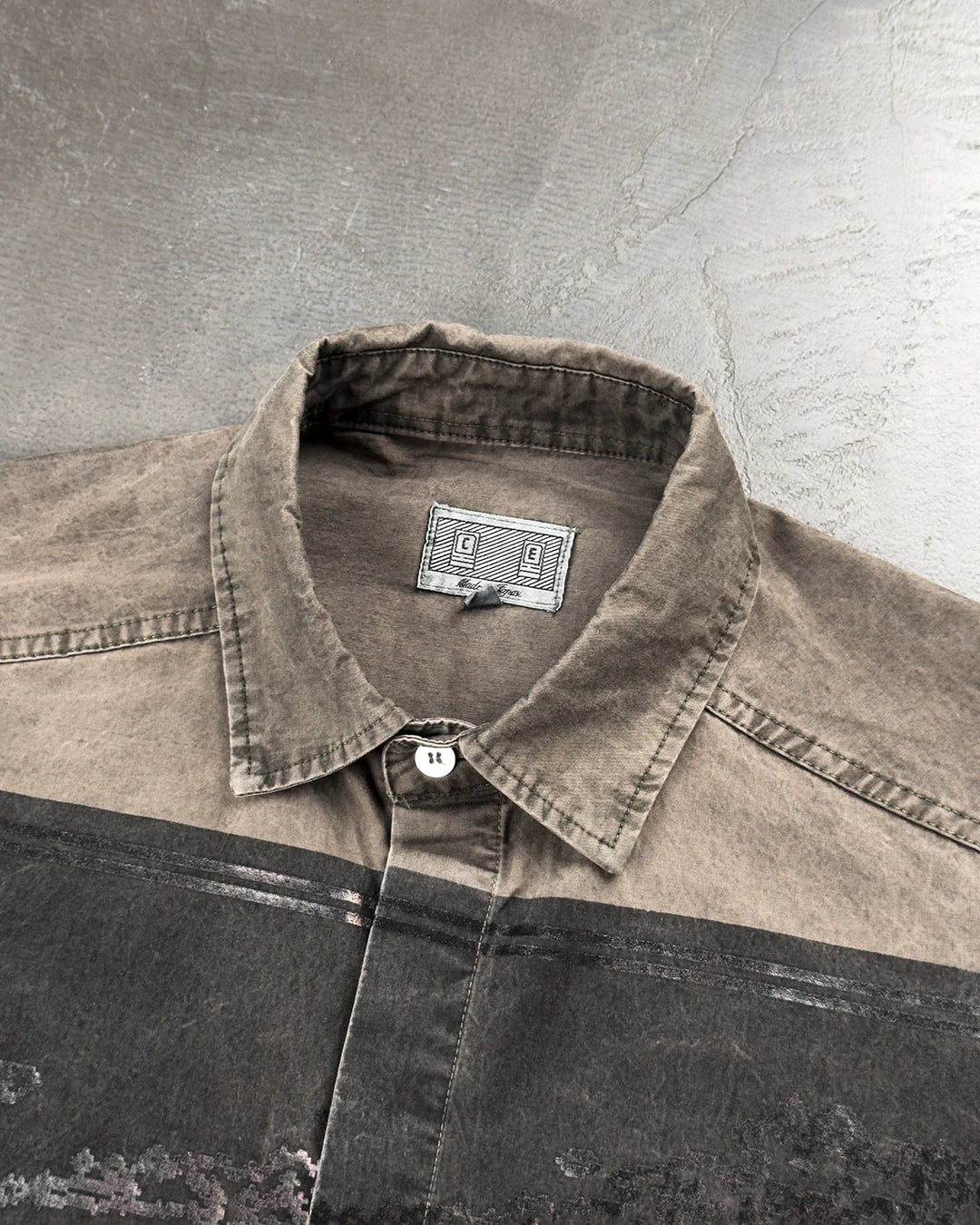 Сорочка сірого кольору від CAV EMPT з деніму в стилі ретро. Класичний комір, прихована застібка на ґудзики, регульовані манжети на ґудзику. Друкований принт чорного кольору на грудях та спині, червона гумова нашивка з логотипом на лівому рукаві.