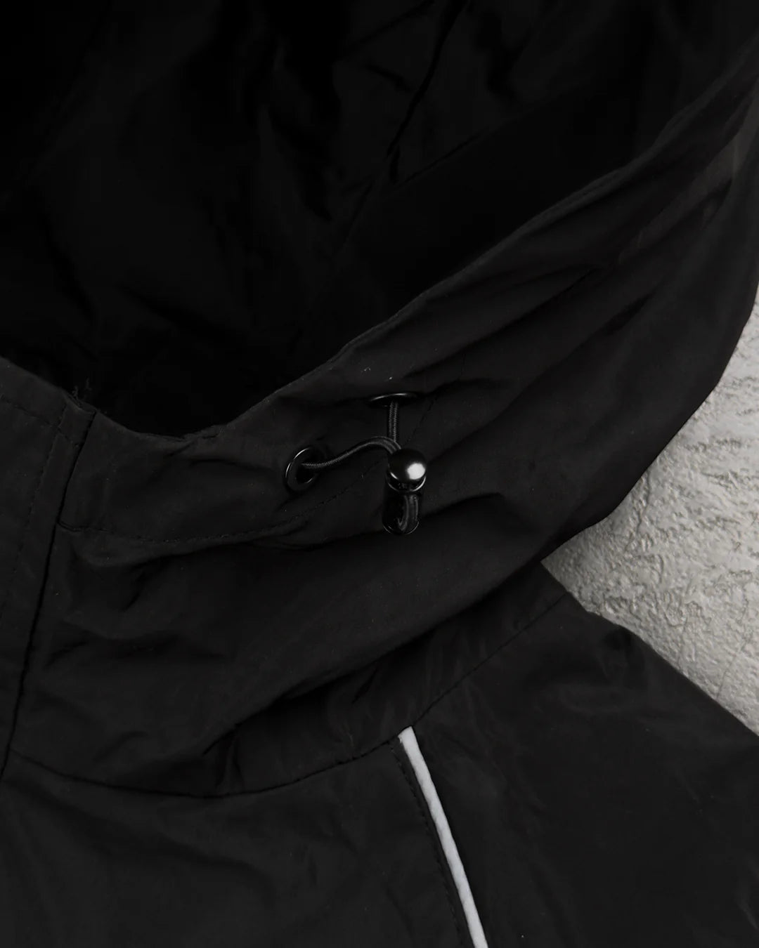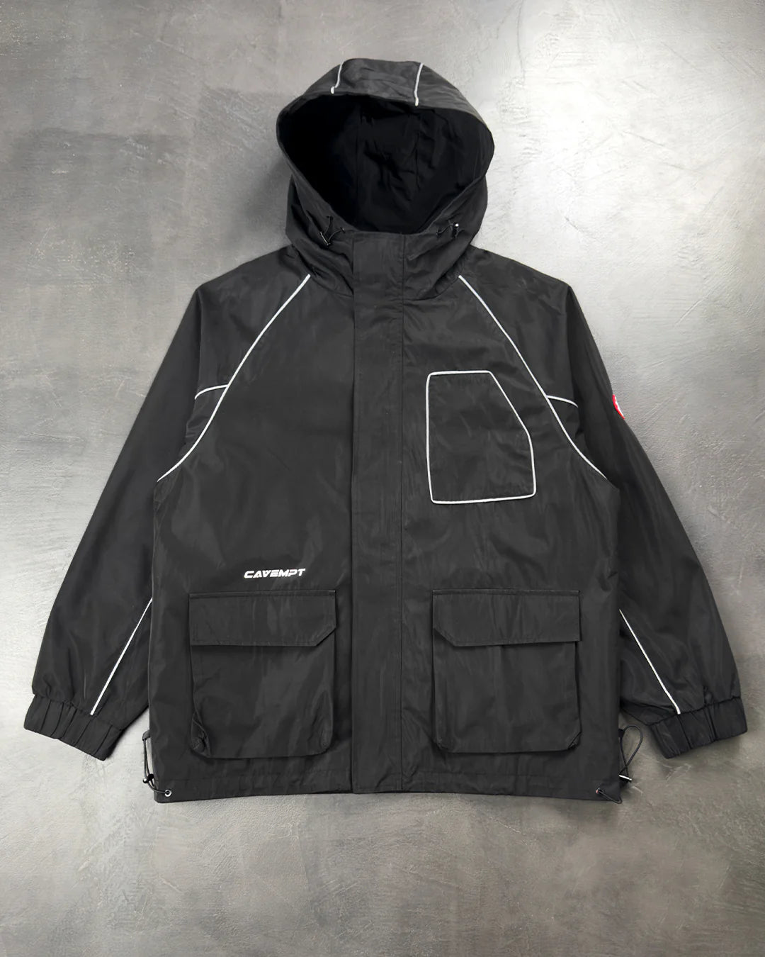 Куртка чорного кольору від CAV EMPT. Регульований капюшон, еластичні манжети, регульований нижній поділ, дві накладні кишені. Друковане брендування, червоний гумовий логотип на лівому рукаві.