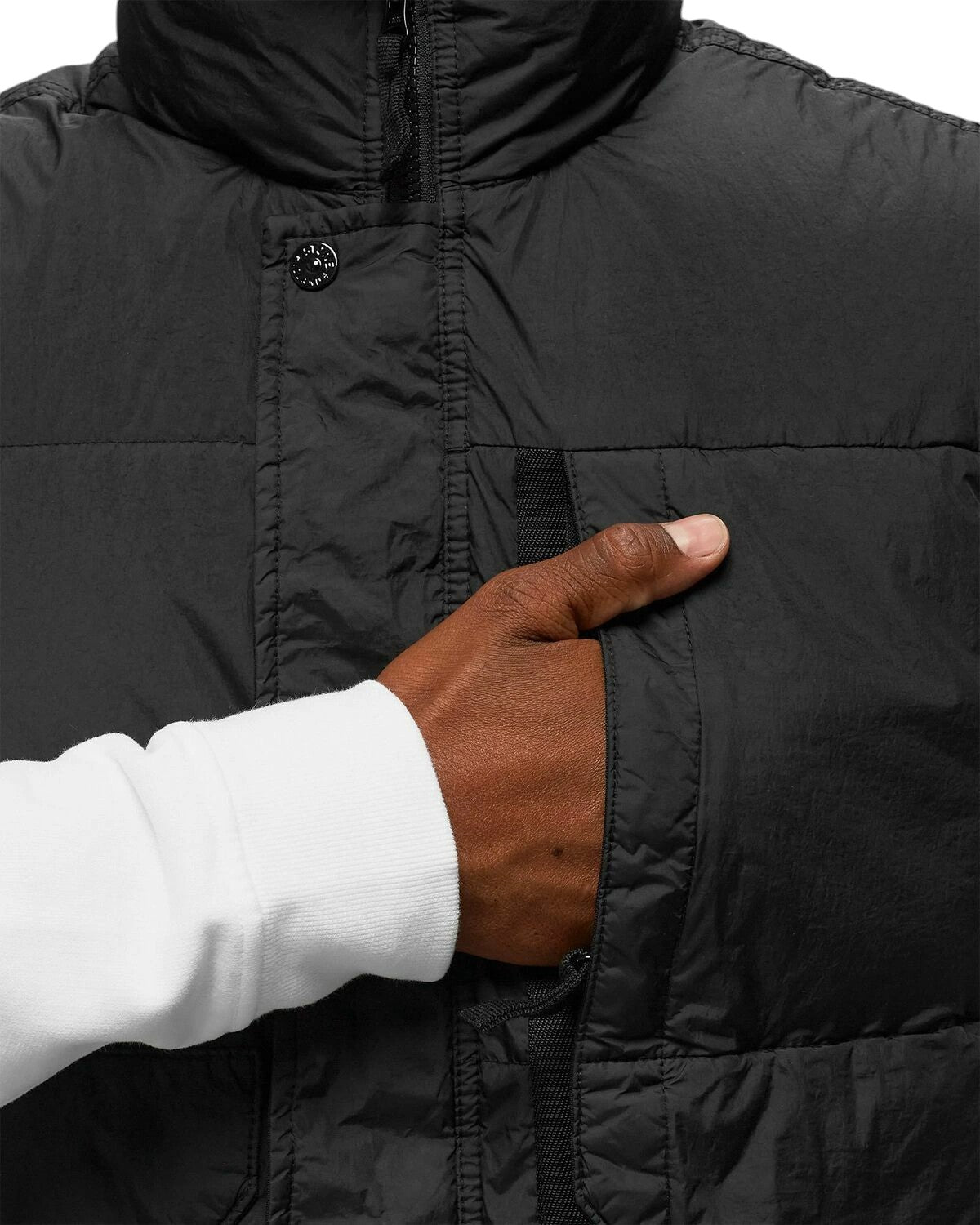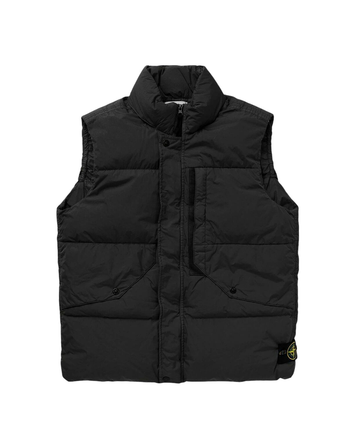Stone Island G0423 Crinkle Reps Recycled Nylon Down Vest — це жилет, виготовлений зі 100% переробленого легкого нейлону з надщільним плетінням, що забезпечує вітрозахист і легкий водовідштовхувальний ефект. Завдяки внутрішньому смолянистому покриттю та унікальній технології фарбування тканина набуває характерної зморшкуватої текстури з неповторними відтінками кольору. Наповнення з високоякісного качиного пуху, сертифікованого за стандартом RDS (Responsible Down Standard), гарантує оптимальне тепло при мінімальній вазі. Модель оснащена коміром-стійкою з прихованим капюшоном, великою нагрудною кишенею, косими кишенями з клапанами та двосторонньою блискавкою з прихованою планкою. Завершує дизайн фірмова емблема Stone Island зліва внизу.