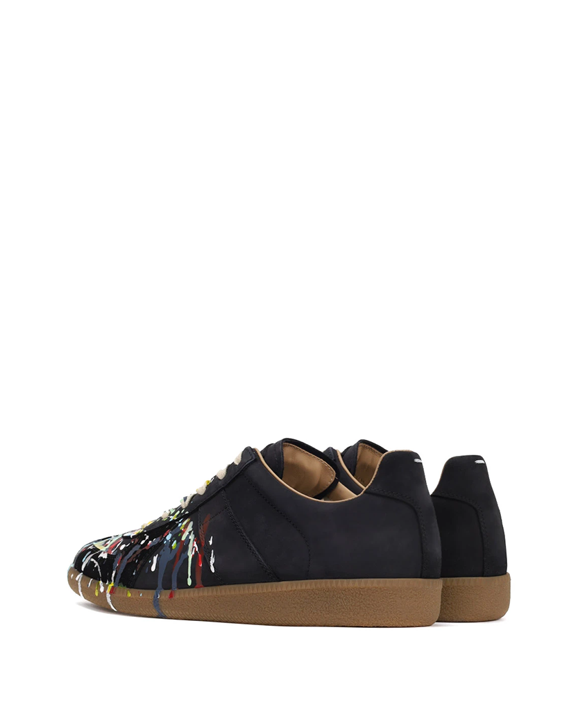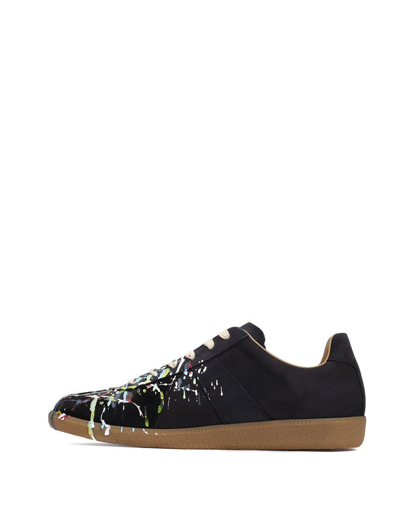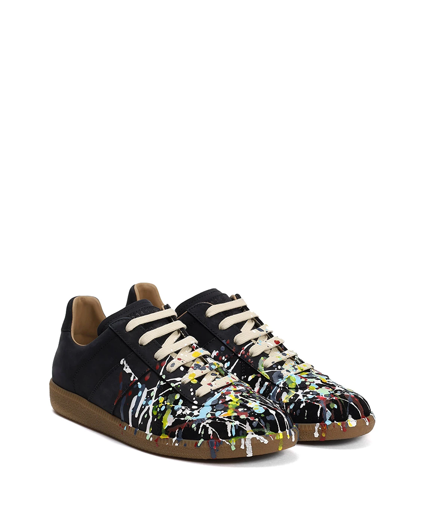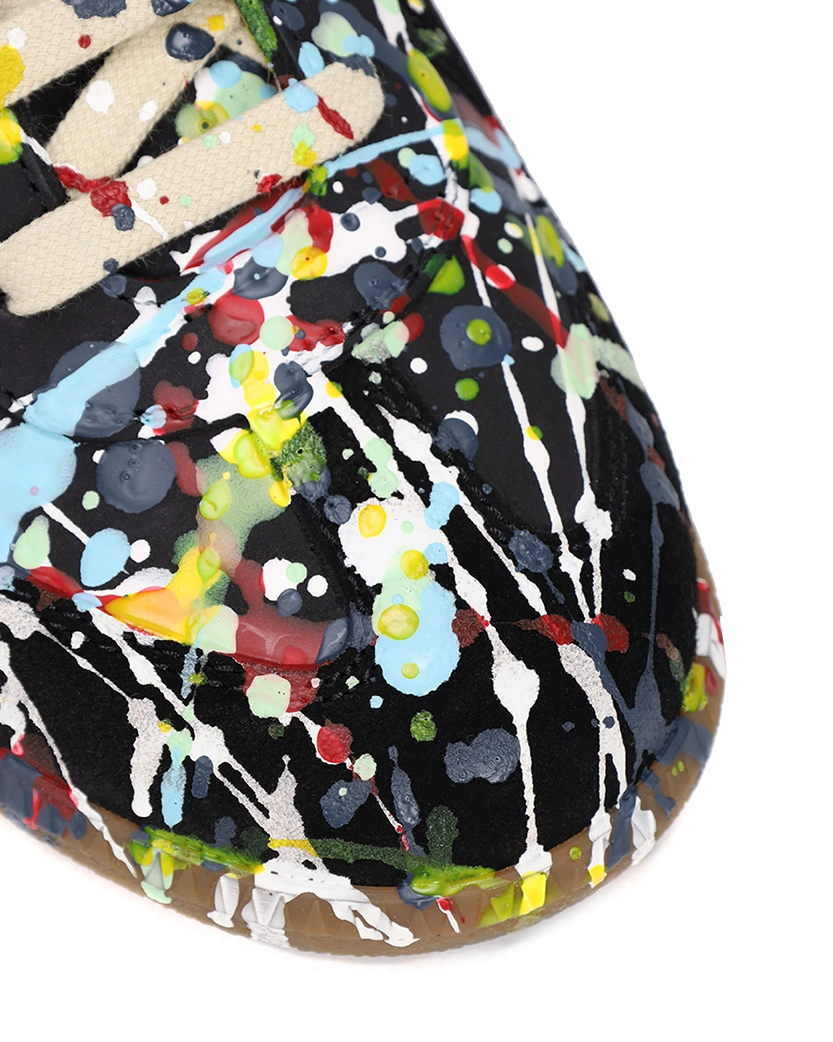Maison Margiela Replica Sneakers Black/Paint — це інтерпретація легендарних кросівок бренду в арт-естетиці. Модель натхнена класичним австрійським спортивним взуттям 70-х років і вирізняється поєднанням шкіри та м’якої замші. Унікальність кожної пари підкреслюють хаотичні, нанесені вручну кольорові мазки фарби — фірмова деталь Maison Margiela. Кросівки доповнено гнучкою гумовою підошвою, м’якою текстильною підкладкою та впізнаваною номерною нашивкою на язичку. Ця модель поєднує мінімалізм, провокаційність і високу майстерність крою, що є синонімами бренду.