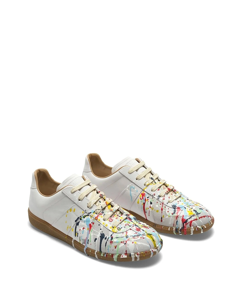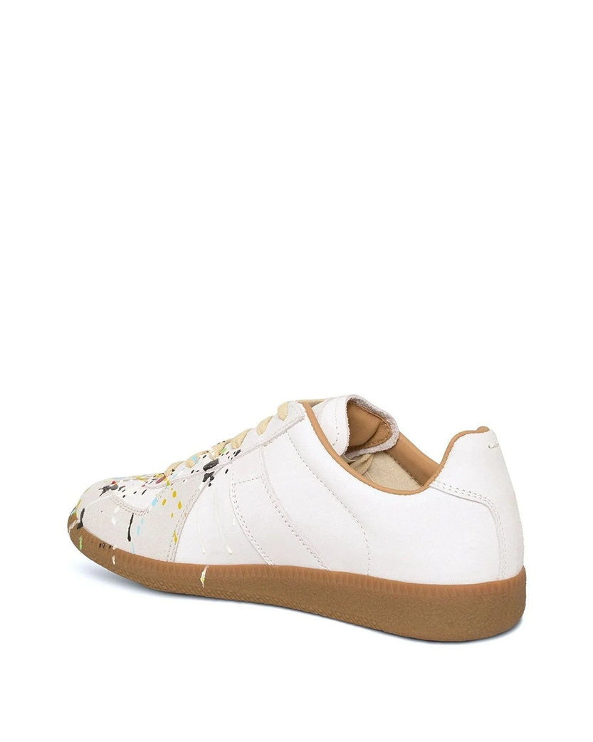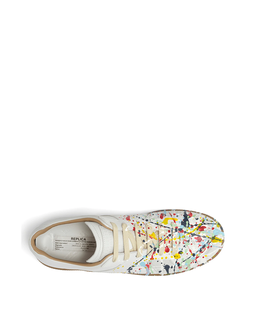 Maison Margiela Replica Sneakers White/Paint — це інтерпретація легендарних кросівок бренду в арт-естетиці. Модель натхнена класичним австрійським спортивним взуттям 70-х років і вирізняється поєднанням шкіри та м’якої замші. Унікальність кожної пари підкреслюють хаотичні, нанесені вручну кольорові мазки фарби — фірмова деталь Maison Margiela. Кросівки доповнено гнучкою гумовою підошвою, м’якою текстильною підкладкою та впізнаваною номерною нашивкою на язичку. Ця модель поєднує мінімалізм, провокаційність і високу майстерність крою, що є синонімами бренду.