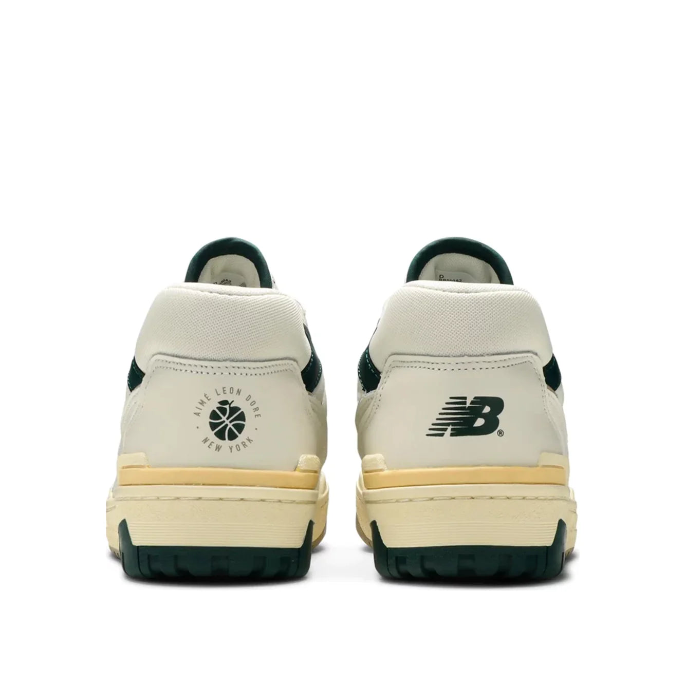 Модель New Balance 550 x Aimé Leon Dore Green Yellow взята з великої капсульної колекції, розробленої у партнерстві з нью-йоркським лейблом чоловічого одягу. Знову представлені публіці Еме Леоном Доре у 2020 році, кросівки-обручі кінця 80-х повертаються менш ніж через рік у традиційному виконанні з білої шкіри з контрастними зеленими та жовтими акцентами. До стандартного брендингу New Balance додаються логотипи ALD на лівій п'яті та обидва ткані язички. Попередньо пожовкла підошва підкреслює вінтажний вигляд кросівок.