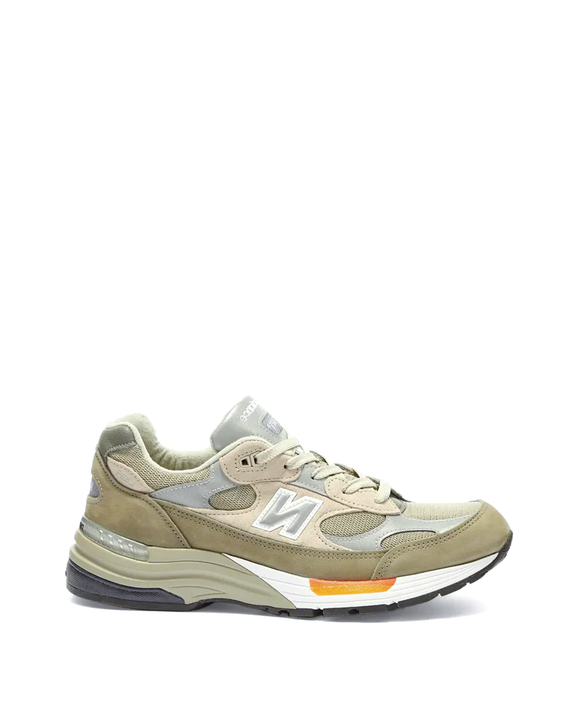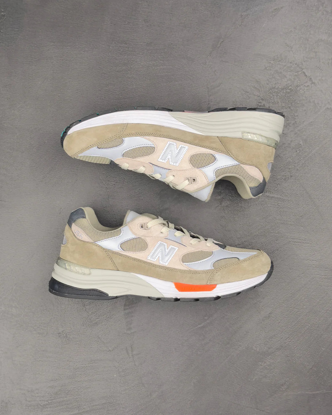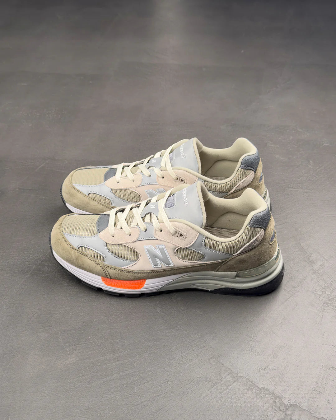 Кросівки New Balance 992 x WTAPS Olive Drab, створені у партнерстві з японським брендом вуличного одягу, використовують преміальну конструкцію, що поєднує дихаючу сітку та замшу. Стандартний сірий колір New Balance поєднується з оливково-зеленим від WTAPS, підкресленим помаранчевою вставкою на підошві, щоб завершити естетику, натхненну стилем мілітарі. Сріблясті світловідбиваючі деталі розташовані по всьому верху, включаючи язичок з подвійним брендингом.