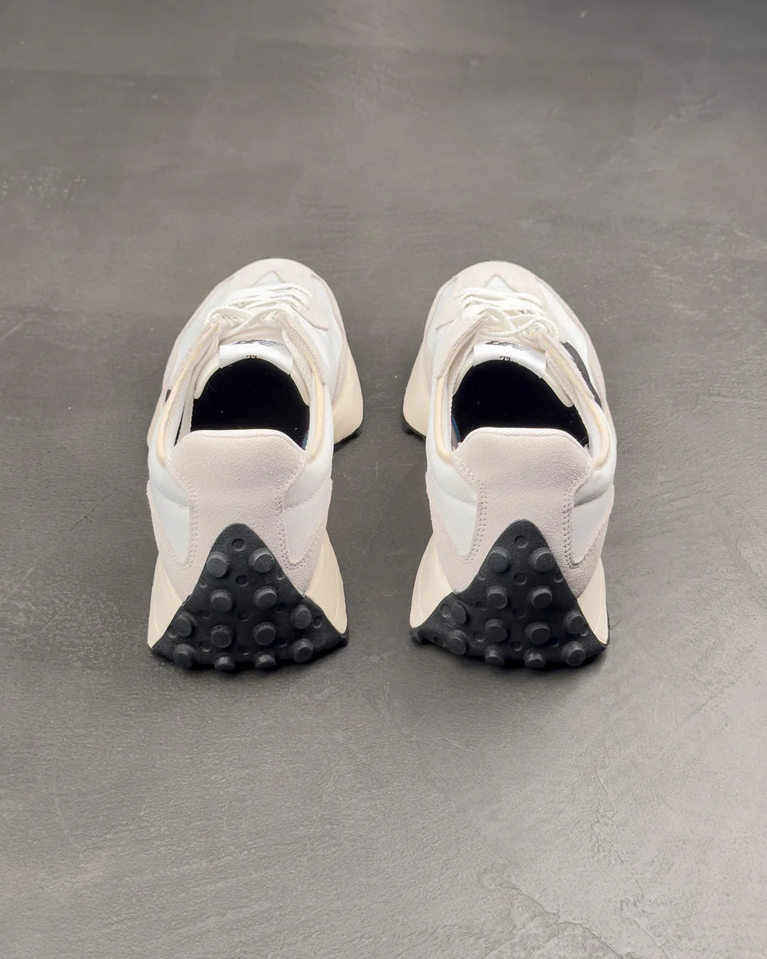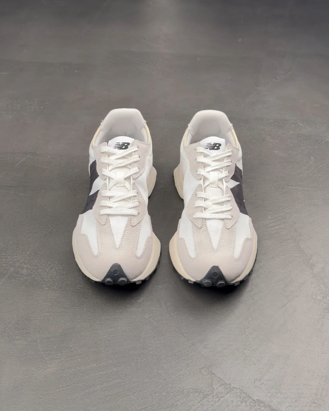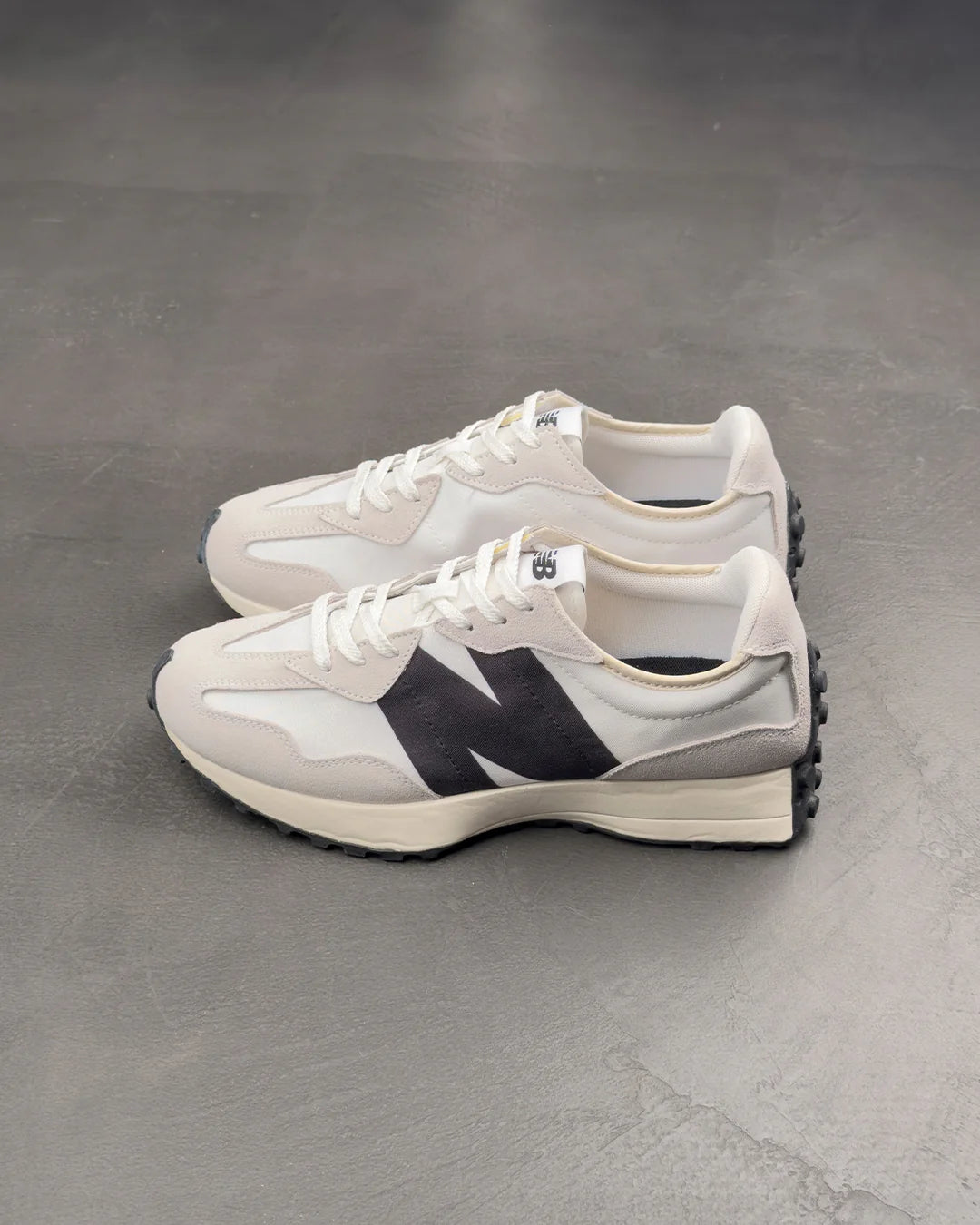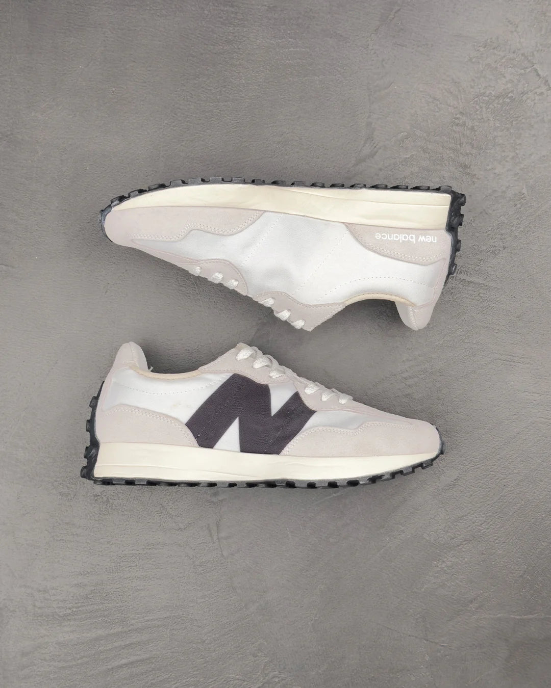 Ця модель 327 має, можливо, один з найчистіших на вигляд варіантів. Бігові кросівки у вінтажному стилі мають сітчасту основу білого кольору в поєднанні з пом'якшеним сірим кольором на замшевих накладках. Логотип New Balance "N", який важко не помітити, прикрашає бокові частини, а також логотип NB на язичку та устілках. Нарешті, дизайн завершується проміжною підошвою з міцної чорної гуми, яка проходить від верхньої частини п'яти до носка.