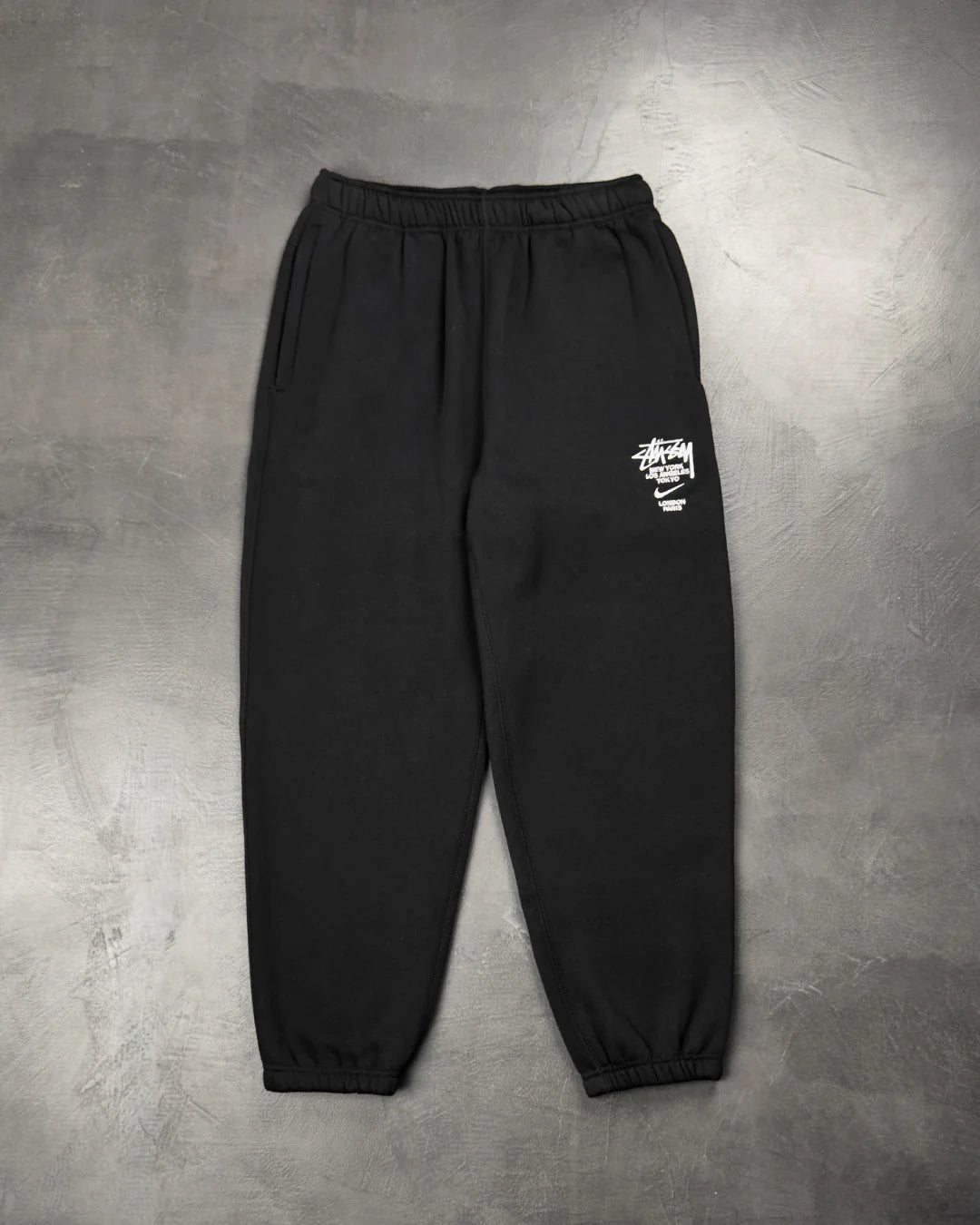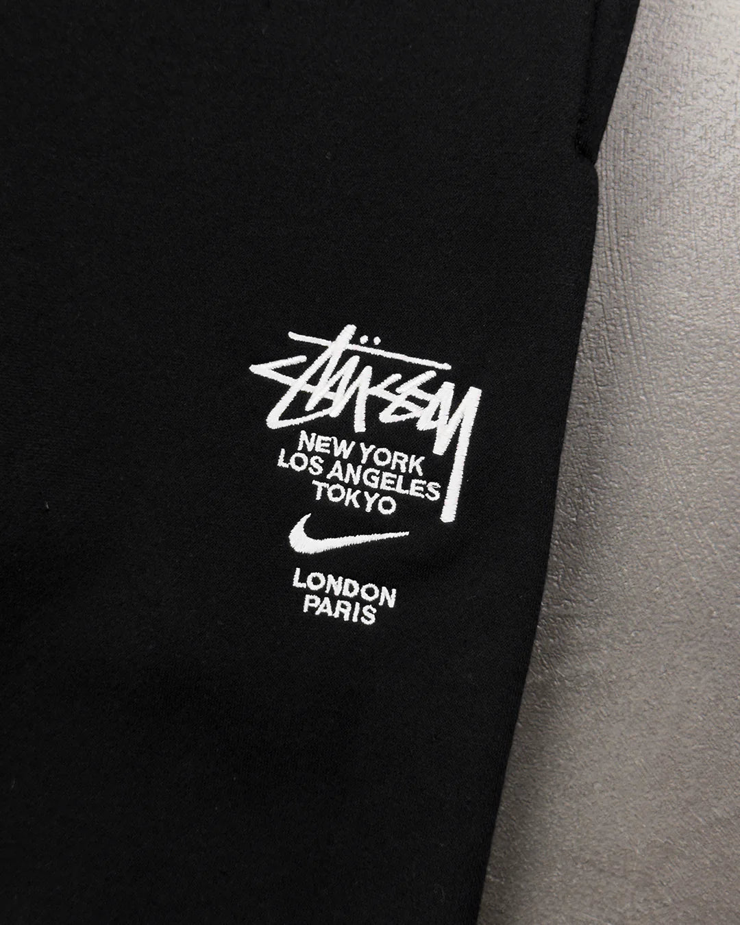 З моменту своєї першої співпраці 2000 року, бренди Nike і Stüssy розробляли дизайн на перетині вуличного одягу і спортивного дозвілля. Те саме і в цьому сезоні, що доводять ці чорні спортивні штани. Вони зроблені з суміші бавовни з флісовою підкладкою для комфорту в місті, а спільний брендинг - зокрема, графіка Swoosh і світового турне Stüssy - вишита на стегні білою ниткою.
