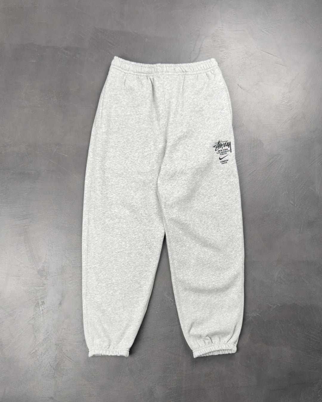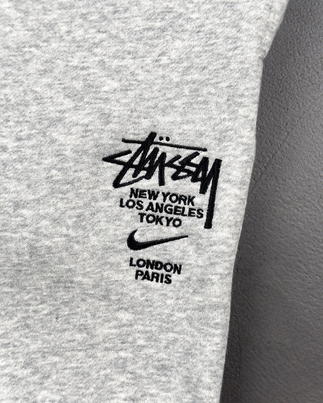 З моменту свого першого співробітництва у 2000 році Nike та Stüssy розробляли дизайн на перетині вуличного одягу та спортивного дозвілля. Те саме і цього сезону, що доводять ці сірі спортивні штани. Вони виготовлені із суміші бавовни з флісовою підкладкою для комфорту в місті, а спільний брендинг — зокрема, графіка Swoosh та світового турне Stüssy — вишита на стегні чорною ниткою.