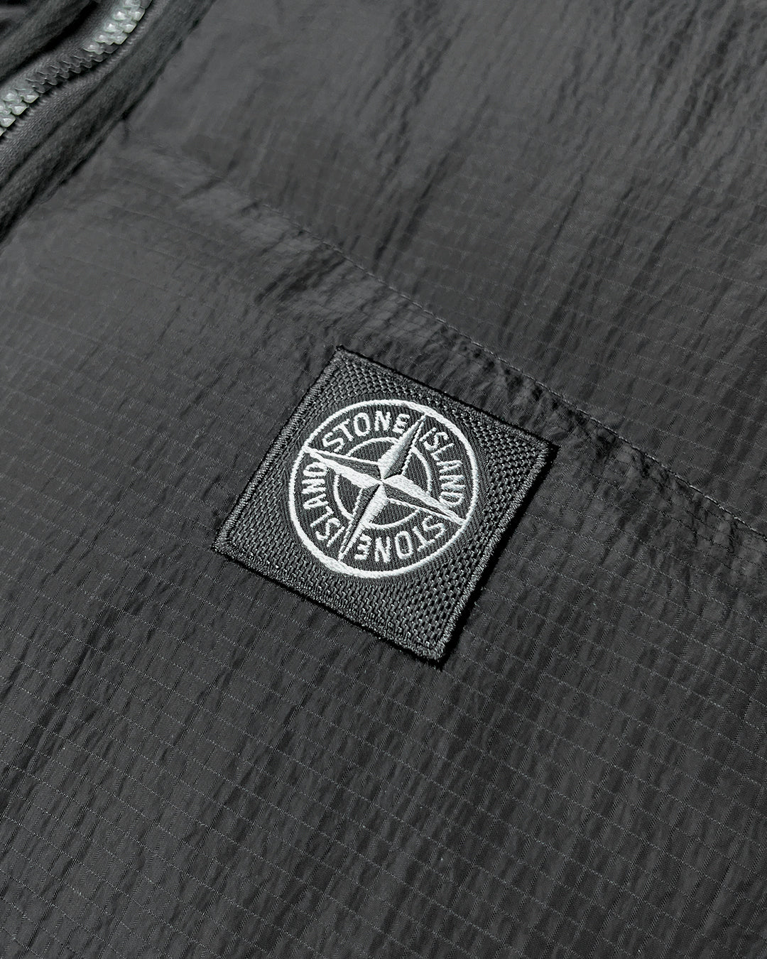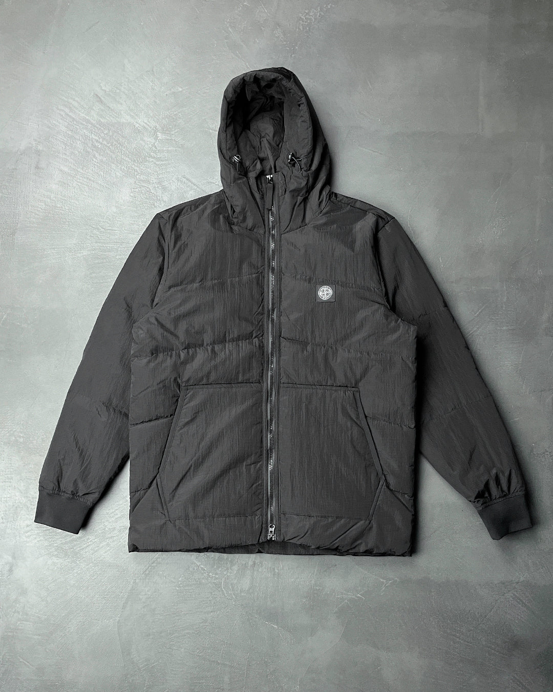 Пуховик з капюшоном із Nylon Watro Ripstop. Тридольна структура нейлонових волокон та особлива технологія фарбування пряжі (нитки качка – у сірий, нитки основи – у білий колір) надають металізованому, переливчастому ефекту текстурі Nylon Metal – однієї з найуніверсальніших тканин, розроблених текстильною лабораторією STONE ISLAND. Ця модель характеризується переплетенням мікроріпстопу. Смоляне просочування тканини з виворітного боку надає виробу вітро- та вологостійкості легкого ступеня. Готовий виріб піддається двоступінчастій процедурі фарбування, в результаті якої волокна і текстильні аксесуари набувають багатої палітри відтінків різного ступеня інтенсивності. Додавання спеціального агента до барвної суміші робить виріб водонепроникним. Спеціально розроблені застібки-блискавки також піддаються фарбуванню.