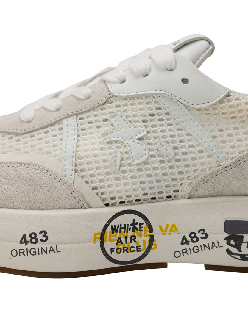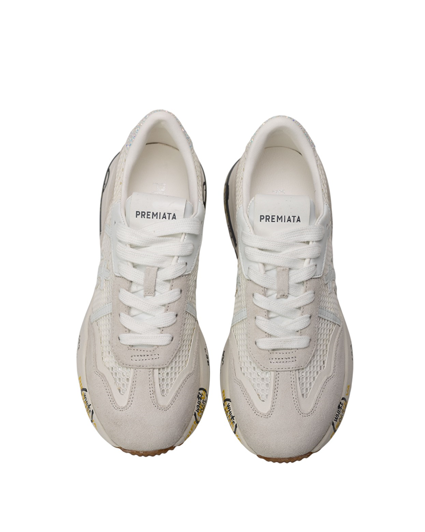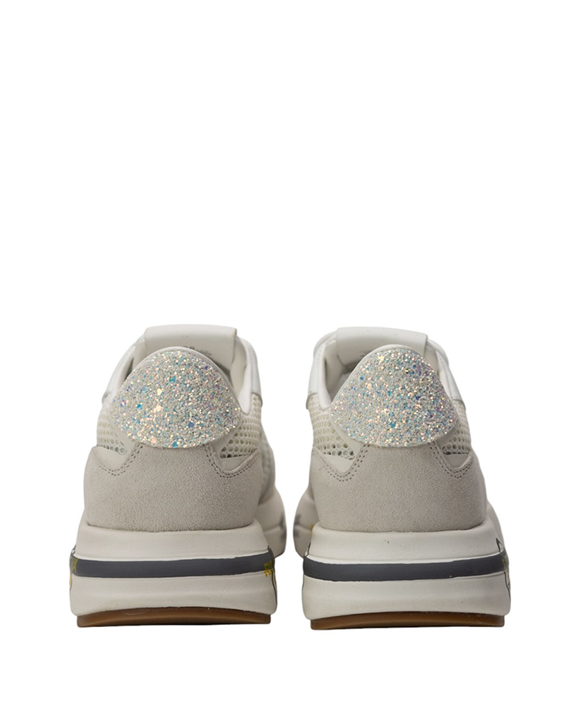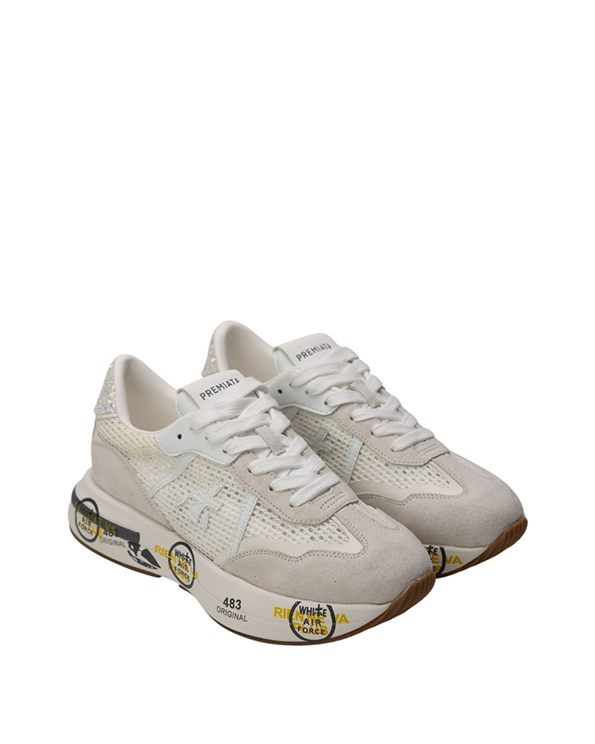 Модель Cassie від Premiata поєднує спортивну легкість і вишуканий декор. Замша та сітка створюють дихаючий верх, а п’ята з блискітками додає образу яскравого акценту. Шкіряний логотип, зручна устілка й фірмова масивна підошва з логотипом формують стильний та сучасний силует.