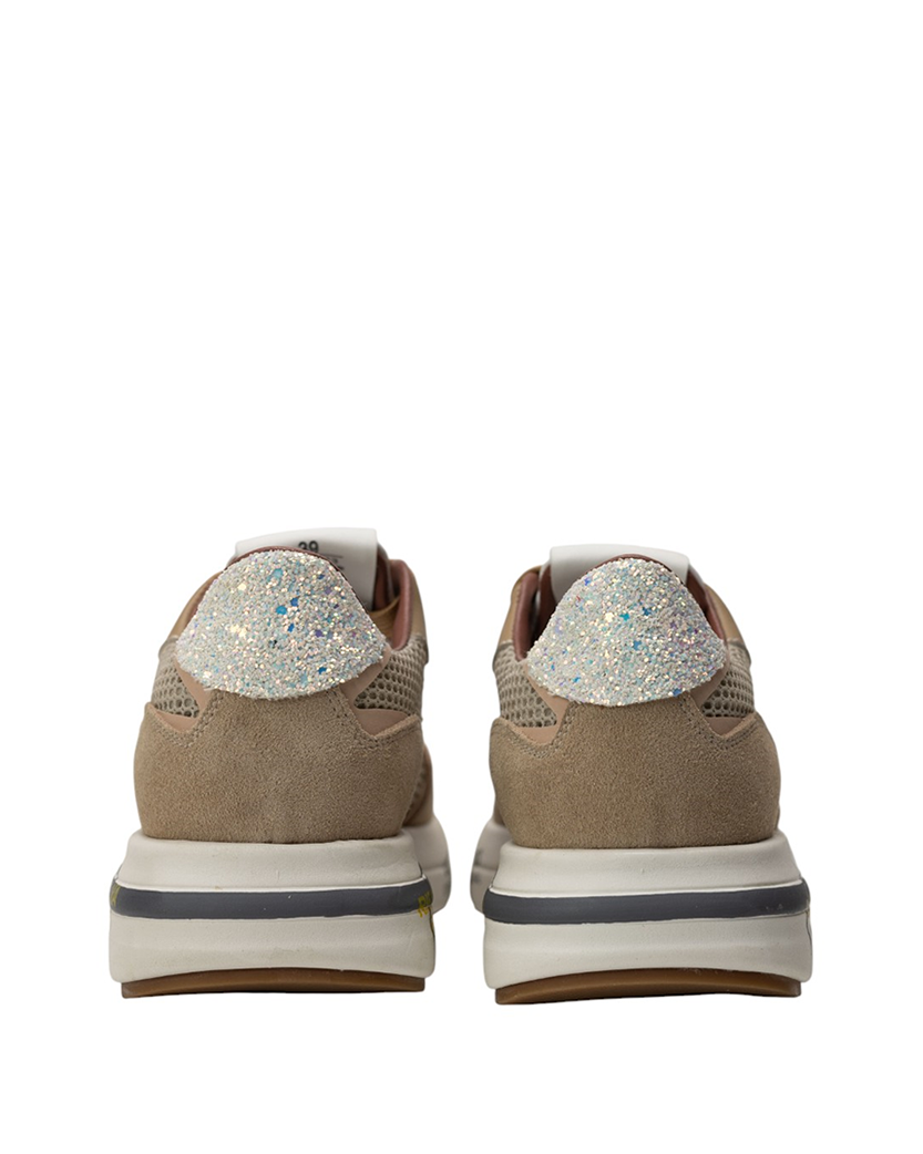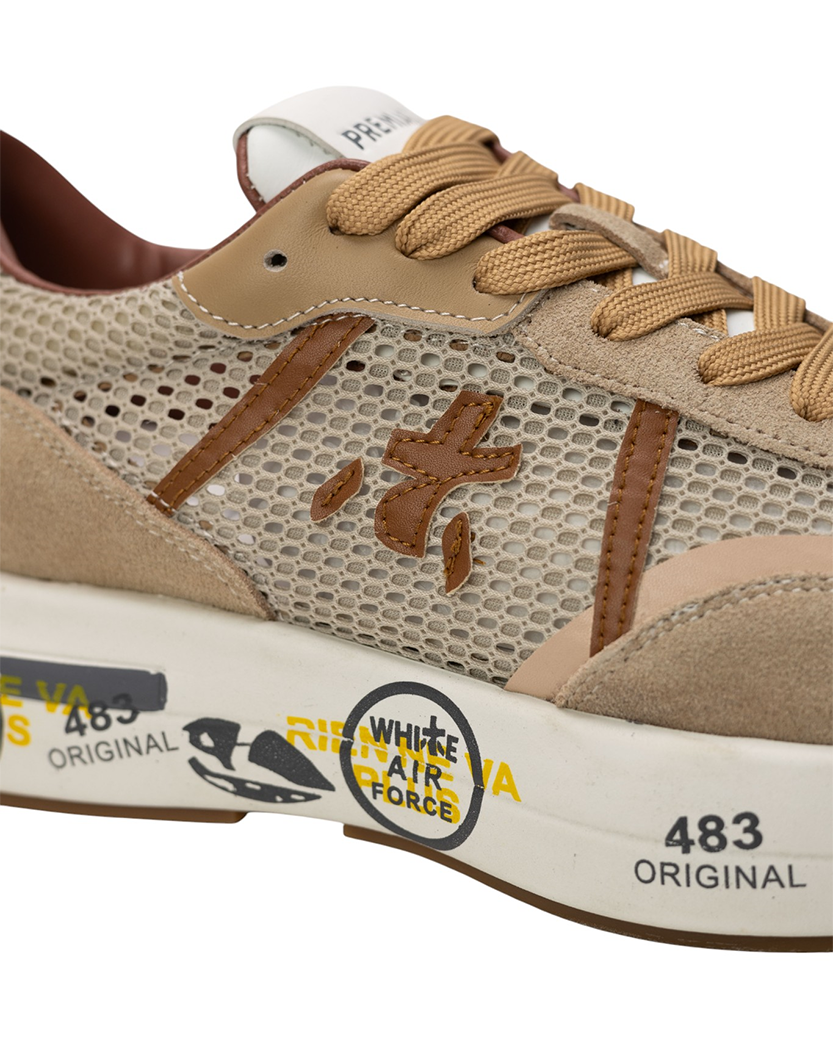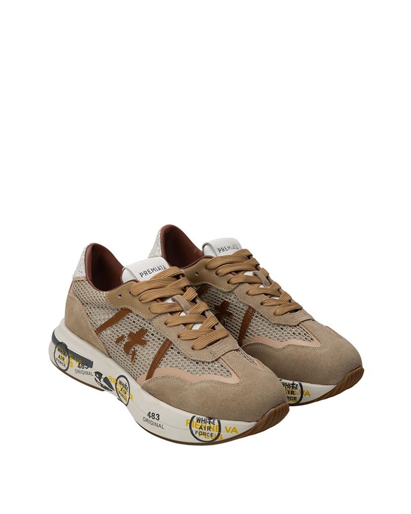 Модель Cassie від Premiata поєднує спортивну легкість і вишуканий декор. Замша та сітка створюють дихаючий верх, а п’ята з блискітками додає образу яскравого акценту. Шкіряний логотип, зручна устілка й фірмова масивна підошва з логотипом формують стильний та сучасний силует.