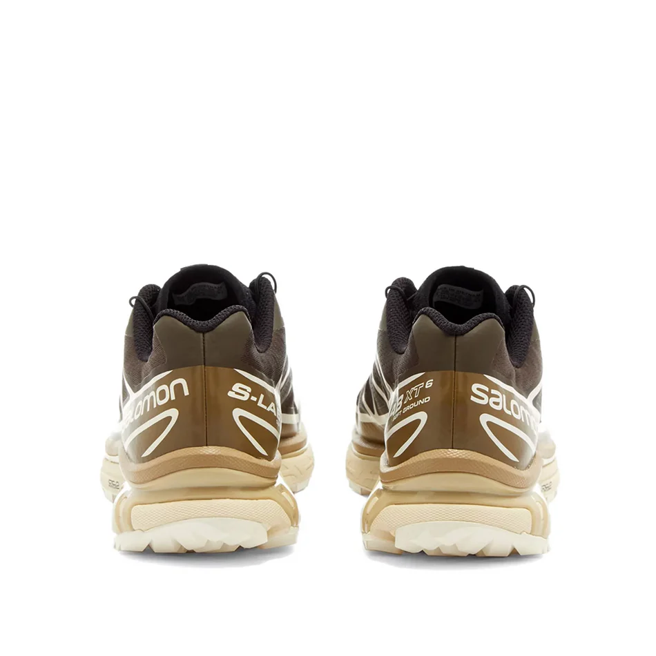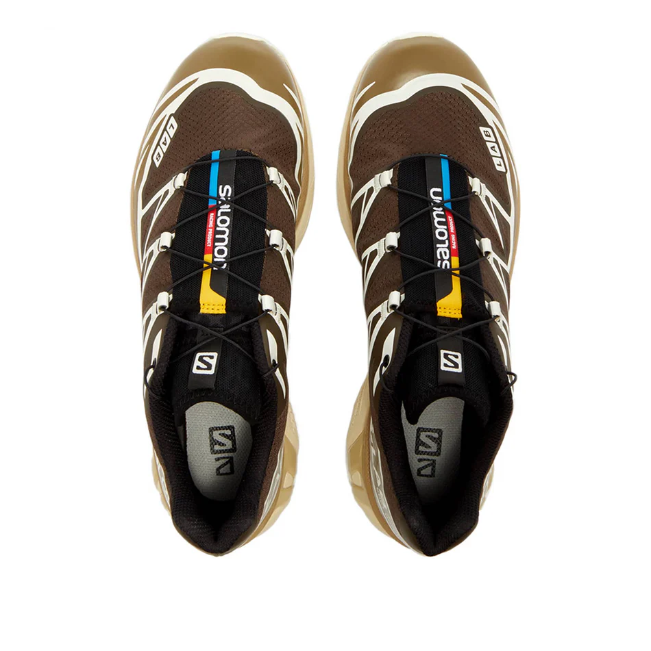 Ця модель XT-6 має сітчасту підошву титульного темно-коричневого кольору Wren. Погодостійкі накладки з TPU, що вистилають підошву, мають світліший коричневий відтінок Kangaroo. На темному тлі бічної п'яткової панелі виділяється брендинг Salomon у білому кольорі. Взуття оснащене тонкими чорними шнурками та системою швидкого застібання, що дозволяє легко взуватися та роззуватися. Синій, червоний та жовтий кольори виділяються на язичку разом з білим брендингом Salomon. Проміжна підошва з EVA бежевого та ванільного льоду та біла підошва з шипами завершують стиль цих кросівок.