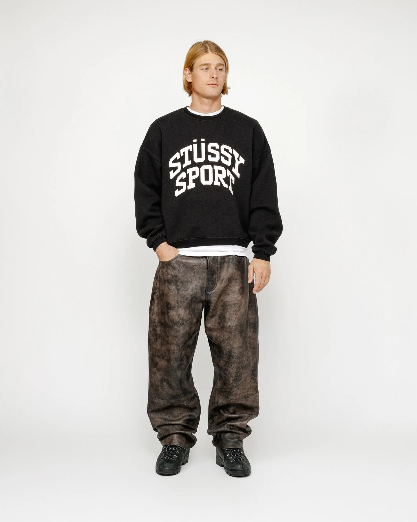 Світшот STUSSY Big Crackle Sport Crew виготовлений із щільної бавовняної суміші вагою 15,8 унцій. Модель має широкий крій, круглий виріз із ребристою обробкою, а також манжети й поділ із такої ж тканини. Спереду прикрашений логотипом Stüssy Sport з ефектом потріскування.