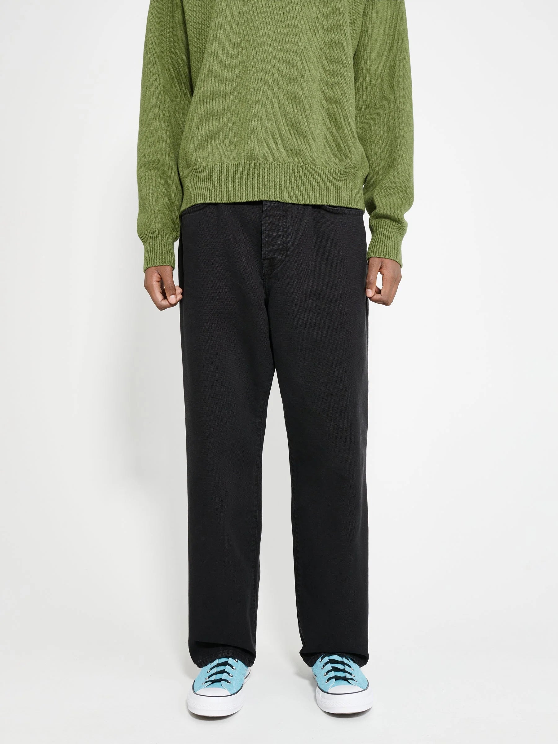 Джинси від Stüssy. Виготовлені з випраного бавовняного деніму, з тональними верхніми швами та вишивкою на лівій задній штанині. Застібка на блискавку та ґудзик, металеві заклепки, петлі для ременя на талії, брендована шкіряна нашивка ззаду та п'ять кишень.