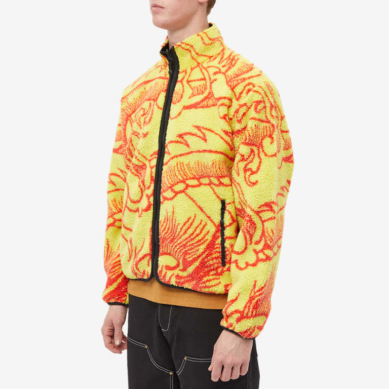 Двостороння куртка Stüssy, виготовлена з однієї сторони з шерстяного флісу з жакардовим малюнком та з нейлону з іншої сторони. Високий комір та двостороння застібка-блискавка для зручності, а вертикальні кишені з обох боків для ще більшої функціональності. Застібки-блискавки з лайкрою, манжети та поділ додають комфорту в носінні, а логотип Stüssy, надрукований на грудях, підкреслює автентичність та стиль бренду.