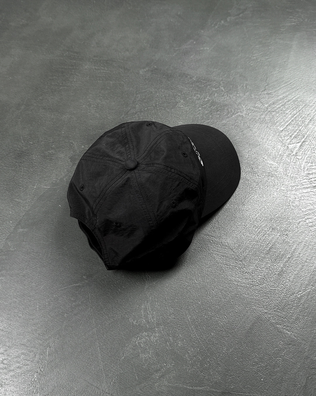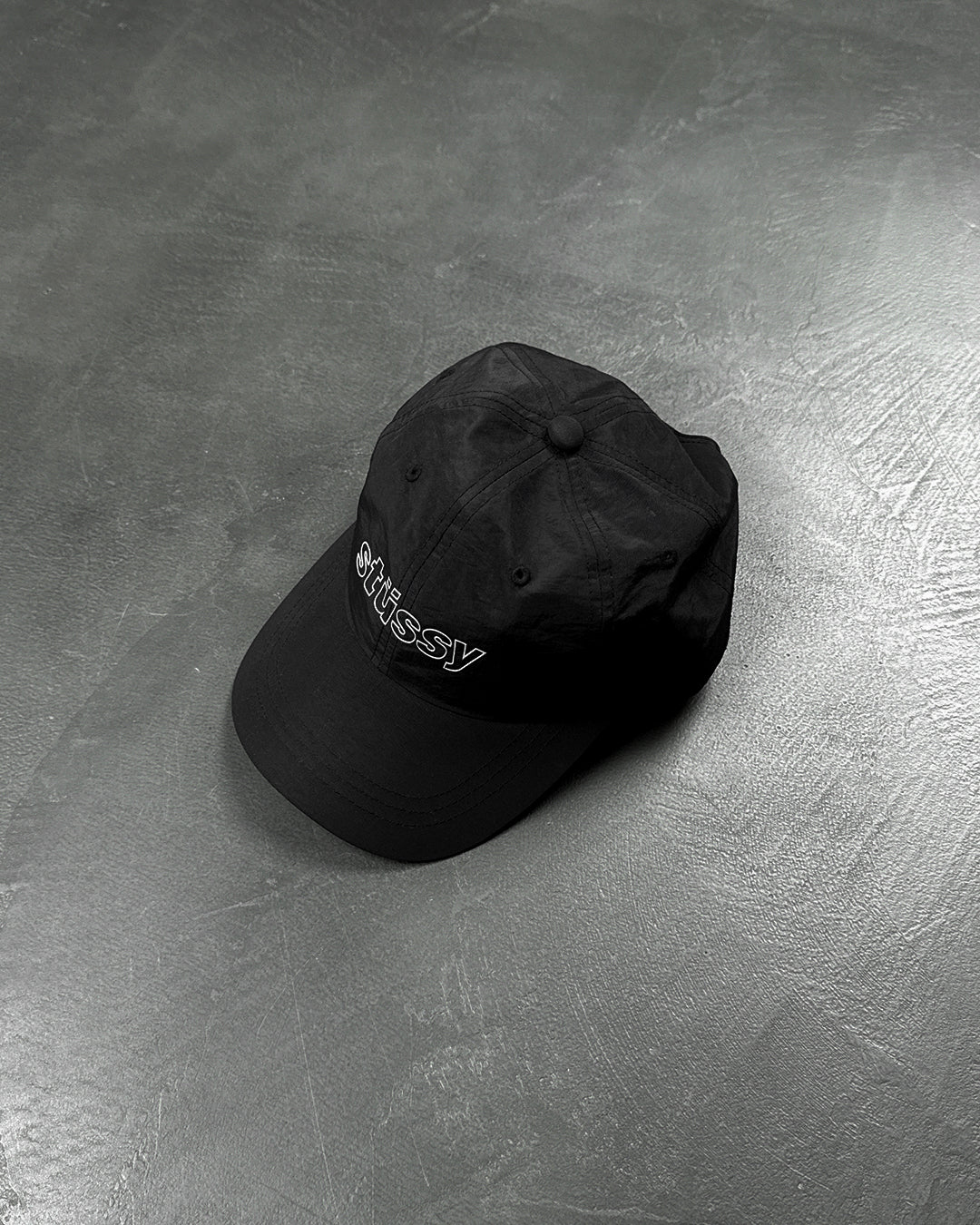 Шестипанельна кепка від Stussy, виготовлена з чорного нейлону з структурованим козирком. На козирку нанесений світловідбиваючий логотип Stussy, який повторюється ззаду на застібці на липучці.