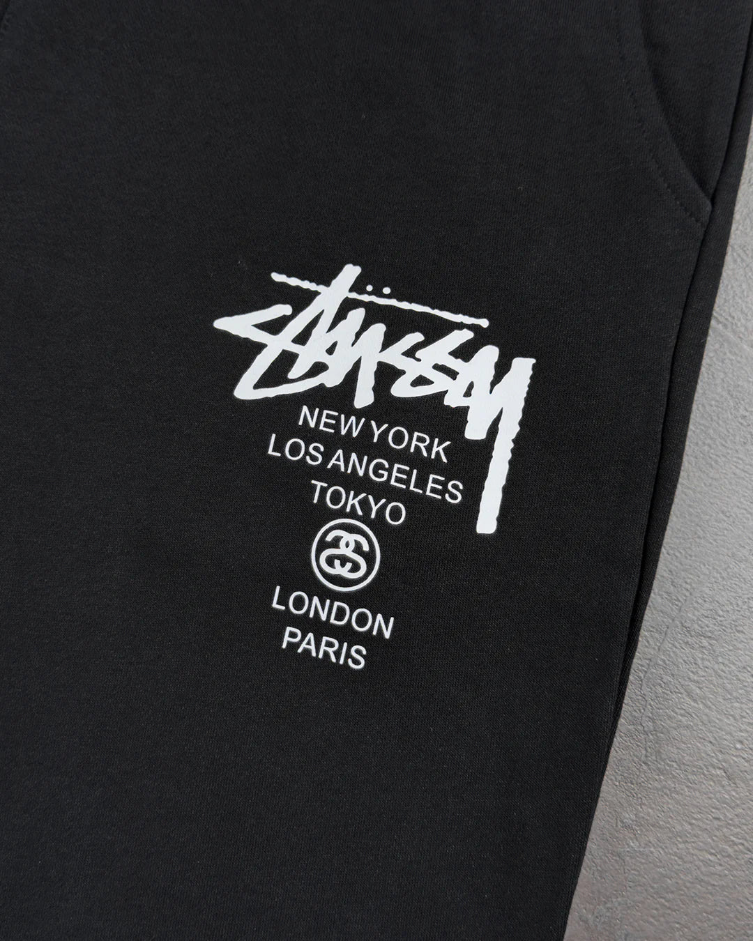 Спортивні штани World Tour Sweatpants - відмінний приклад того, як STUSSY вдаються до виняткового переосмислення класичних спортивних силуетів. Замисловитий підхід до традиційного дизайну, вони зроблені з вільного крою бавовняної суміші. Мають еластичний пояс і манжети, а також декоровані великим принтом з логотипом.