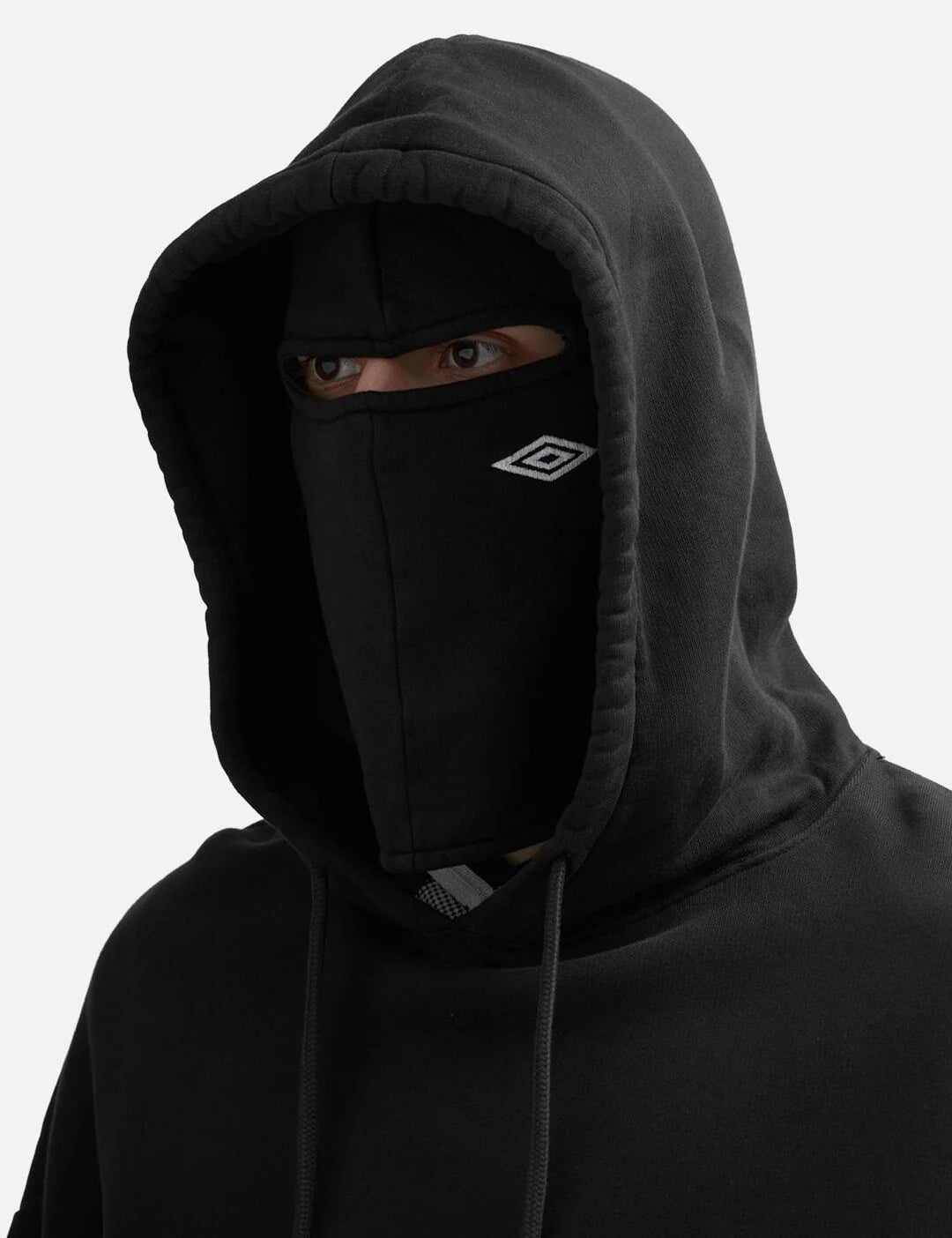 Umbro x Slam Jam Masked Hoodie Black — худі з м’якого бавовняного флісу, що поєднує спортивну функціональність із виразною вуличною естетикою. Модель виконана у вільному крої з опущеними плечима, має капюшон зі шнурком, еластичні манжети та нижній край для комфортної посадки.